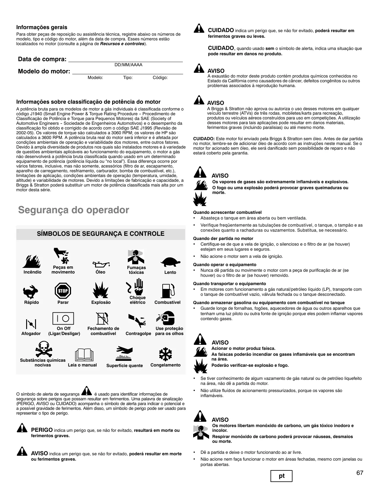 AVISO Modelo: Tipo: A exaustão do motor deste produto contém produtos químicos conhecidos no Estado da Califórnia como causadores de câncer, defeitos congênitos ou outros problemas associados à reprodução humana. Código: Informações sobre classificação de potência do motor A potência bruta para os modelos de motor a gás individuais é classificada conforme o código J1940 (Small Engine Power & Torque Rating Procedure -- Procedimento de Classificação de Potência e Torque para Pequenos Motores) da SAE (Society of Automotive Engineers -- Sociedade de Engenheiros Automotivos) e o desempenho da classificação foi obtido e corrigido de acordo com o código SAE J1995 (Revisão de 2002-05). Os valores de torque são calculados a 3060 RPM; os valores de HP são calculados a 3600 RPM. A potência bruta real do motor será inferior e é afetada por condições ambientais de operação e variabilidade dos motores, entre outros fatores. Devido à ampla diversidade de produtos nos quais são instalados motores e à variedade de questões ambientais aplicáveis ao funcionamento do equipamento, o motor a gás não desenvolverá a potência bruta classificada quando usado em um determinado equipamento de potência (potência líquida ou “no local”). Essa diferença ocorre por vários fatores, inclusive, mas não somente, acessórios (filtro de ar, escapamento, aparelho de carregamento, resfriamento, carburador, bomba de combustível, etc.), limitações de aplicação, condições ambientais de operação (temperatura, umidade, altitude) e variabilidade de motores. Devido a limitações de fabricação e capacidade, a Briggs & Stratton poderá substituir um motor de potência classificada mais alta por um motor desta série. Segurança do operador AVISO A Briggs & Stratton não aprova ou autoriza o uso desses motores em qualquer veículo terrestre (ATVs) de três rodas, mobiletes/karts para recreação, produtos ou veículos aéreos construídos para uso em competições. A utilização desses motores para tais aplicações pode resultar em danos materiais, ferimentos graves (incluindo paralisias) ou até mesmo morte. CUIDADO: Este motor foi enviado pela Briggs & Stratton sem óleo. Antes de dar partida no motor, lembre-se de adicionar óleo de acordo com as instruções neste manual. Se o motor for acionado sem óleo, ele será danificado sem possibilidade de reparo e não estará coberto pela garantia. AVISO Os vapores de gases são extremamente inflamáveis e explosivos. O fogo ou uma explosão poderá provocar graves queimaduras ou morte. Quando acrescentar combustível