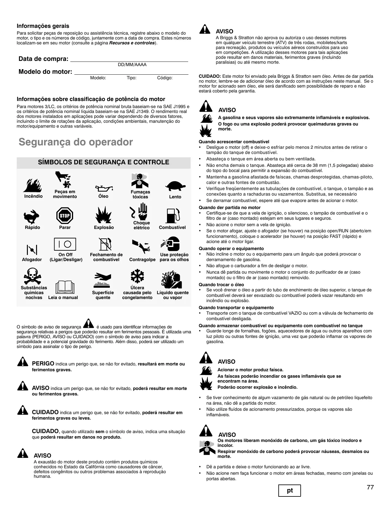 Modelo: Tipo: Código: CUIDADO: Este motor foi enviado pela Briggs & Stratton sem óleo. Antes de dar partida no motor, lembre-se de adicionar óleo de acordo com as instruções neste manual. Se o motor for acionado sem óleo, ele será danificado sem possibilidade de reparo e não estará coberto pela garantia. Informações sobre classificação de potência do motor Para motores 3/LC, os critérios de potência nominal bruta baseiam-se na SAE J1995 e os critérios de potência nominal líquida baseiam-se na SAE J1349. O rendimento real dos motores instalados em aplicações pode variar dependendo de diversos fatores, incluindo o limite de rotações da aplicação, condições ambientais, manutenção do motor/equipamento e outras variáveis. Segurança do operador SÍMBOLOS DE SEGURANÇA E CONTROLE Peças em movimento Incêndio Rápido Parar Afogador On Off (Ligar/Desligar) Fumaças tóxicas Óleo Choque elétrico Explosão Fechamento de combustível Substâncias químicas nocivas Leia o manual Superfície quente Lento Combustível Use proteção Contragolpe para os olhos Úlcera causada pelo Líquido quente congelamento ou vapor AVISO A gasolina e seus vapores são extremamente inflamáveis e explosivos. O fogo ou uma explosão poderá provocar queimaduras graves ou morte. Quando acrescentar combustível