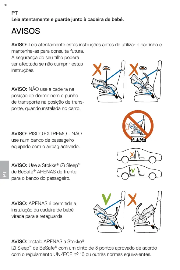 Éste es un asiento infantil de tipo “universal”. Está homologado conforme a la normativa n.º 44.04, para su uso general en vehículos y se adapta perfectamente a la mayoría de los asientos de pasajeros. Ajustará perfectamente en el asiento si el fabricante del vehículo ha declarado en el manual del vehículo que éste admite asientos infantiles de tipo “universal” destinados para este grupo de edad. Este asiento infantil ha sido clasificado como de uso “universal” conforme a unos requisitos más rigurosos que aquellos aplicables a diseños anteriores que no incorporan esta indicación. Si desea obtener información complementaria al respecto, consulte lo siguiente: Tel. 943 130 596, Fax. 943 133 201 E- mail: info.es@stokke.com AVERTISSEMENT: DANGER EXTREME : NE PAS placer sur un siège passager équipé d’un airbag activé. AVERTISSEMENT: utiliser UNIQUEMENT le Stokke® iZi Sleep™ de BeSafe® sur un siège passager face à la route.