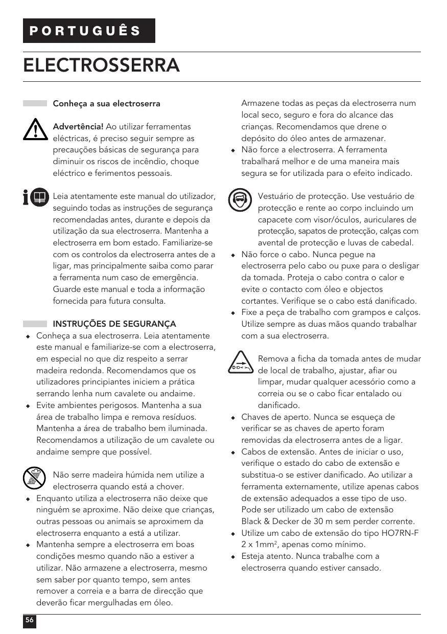 Armazene todas as peças da electroserra num local seco, seguro e fora do alcance das crianças. Recomendamos que drene o depósito do óleo antes de armazenar. Não force a electroserra. A ferramenta trabalhará melhor e de uma maneira mais segura se for utilizada para o efeito indicado. Vestuário de protecção. Use vestuário de protecção e rente ao corpo incluindo um capacete com visor/óculos, auriculares de protecção, sapatos de protecção, calças com avental de protecção e luvas de cabedal. Não force o cabo. Nunca pegue na electroserra pelo cabo ou puxe para o desligar da tomada. Proteja o cabo contra o calor e evite o contacto com óleo e objectos cortantes. Verifique se o cabo está danificado. Fixe a peça de trabalho com grampos e calços. Utilize sempre as duas mãos quando trabalhar com a sua electroserra. Remova a ficha da tomada antes de mudar de local de trabalho, ajustar, afiar ou limpar, mudar qualquer acessório como a correia ou se o cabo ficar entalado ou danificado. Chaves de aperto. Nunca se esqueça de verificar se as chaves de aperto foram removidas da electroserra antes de a ligar. Cabos de extensão. Antes de iniciar o uso, verifique o estado do cabo de extensão e substitua-o se estiver danificado. Ao utilizar a ferramenta externamente, utilize apenas cabos de extensão adequados a esse tipo de uso. Pode ser utilizado um cabo de extensão Black & Decker de 30 m sem perder corrente. Utilize um cabo de extensão do tipo HO7RN-F 2 x 1mm2, apenas como mínimo. Esteja atento. Nunca trabalhe com a electroserra quando estiver cansado. PORTUGUÊS