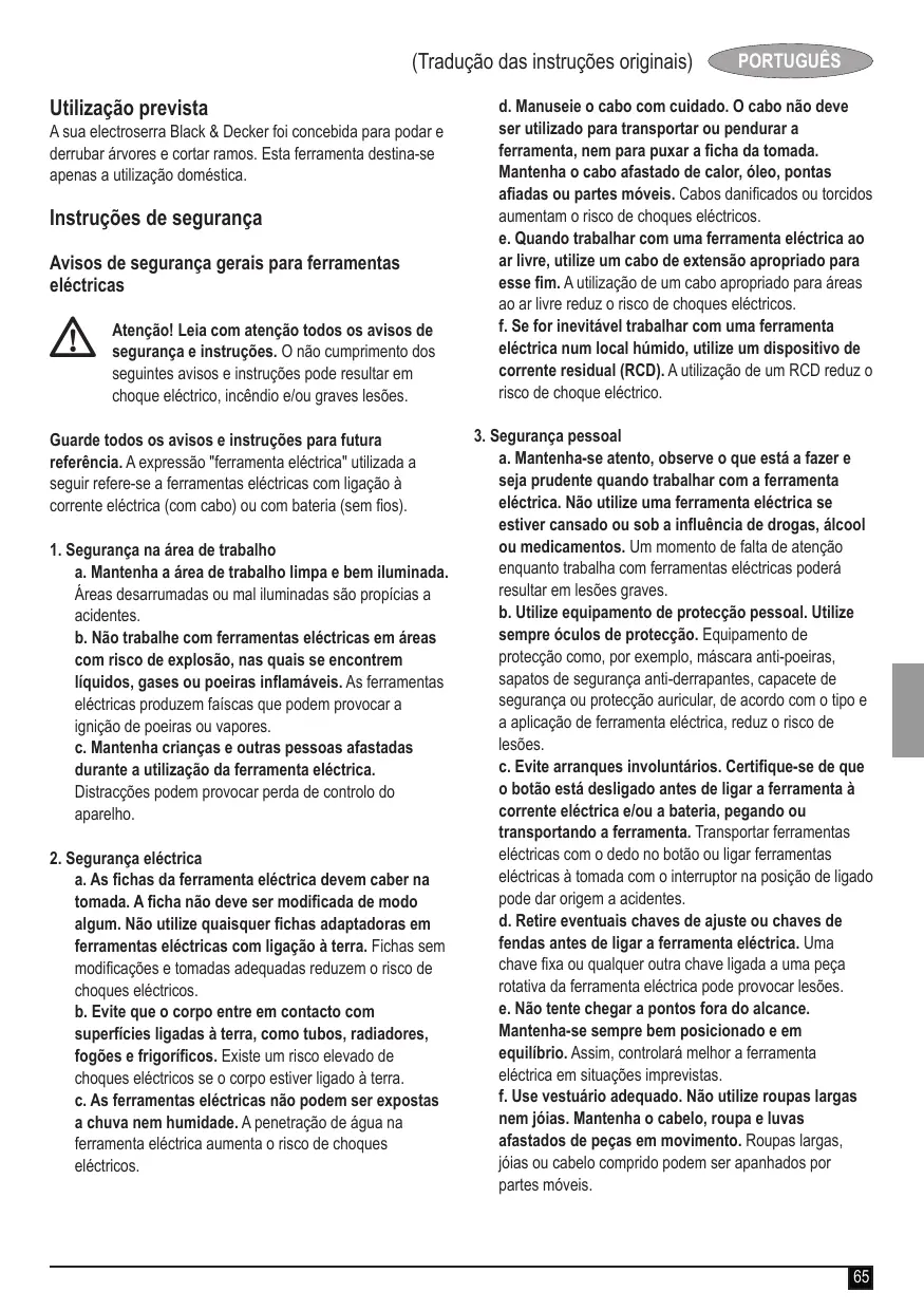 PORTUGUÊS A recolha separada de produtos e embalagens usados permite que os materiais sejam reciclados e reutilizados. A reutilização de materiais reciclados ajuda a evitar a poluição ambiental e reduz a procura de matérias-primas. A legislação local poderá prever a recolha separada de produtos domésticos eléctricos, seja em lixeiras municipais ou através do revendedor quando adquire um produto novo. A Black & Decker dispõe de instalações para recolha e reciclagem de produtos Black & Decker quando estes atingem o fim da vida útil. Para usufruir deste serviço, devolva o produto em qualquer agente de reparação autorizado, que os recolherá em seu nome. Pode verificar a localização do agente de reparação autorizado mais perto de si, contactando os escritórios locais da Black & Decker através do endereço indicado neste manual. Se preferir, pode encontrar na Internet uma lista de agentes de reparação autorizados Black & Decker, detalhes completos e contactos do serviço pós-venda, no endereço: www.2helpU.com Tensão da corrente Verifique regularmente a tensão da corrente da serra. O que fazer se a sua electroserra necessitar de reparação. A sua electroserra foi fabricada em conformidade com os requisitos de segurança aplicáveis. As reparações devem ser realizadas por uma pessoa qualificada utilizando peças sobressalentes originais. Caso contrário, poderão ocorrer perigos consideráveis para o utilizador. Recomendamos que mantenha o manual do utilizador em local seguro. Protecção do ambiente