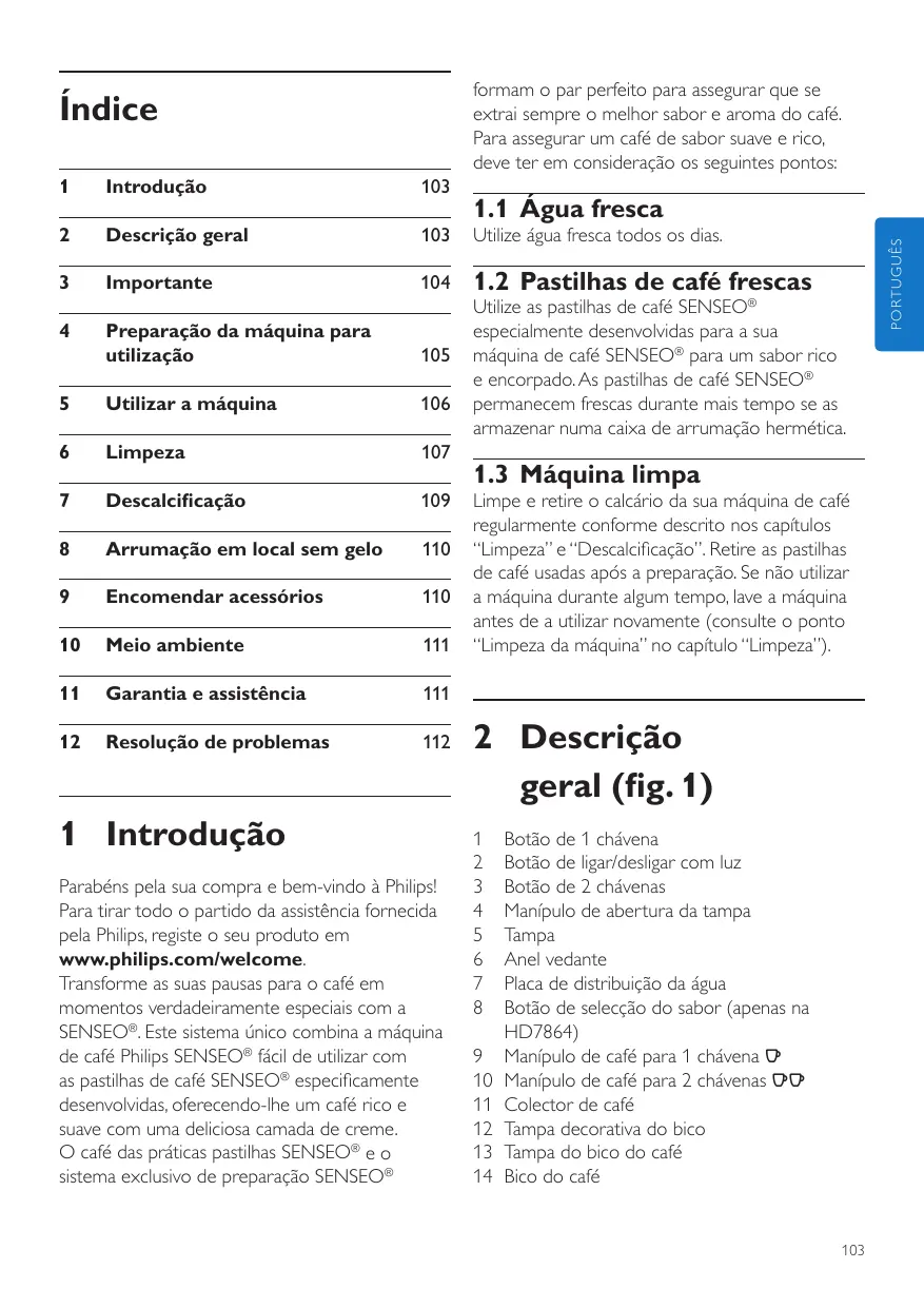 1 Introdução Parabéns pela sua compra e bem-vindo à Philips! Para tirar todo o partido da assistência fornecida pela Philips, registe o seu produto em www.philips.com/welcome. Transforme as suas pausas para o café em momentos verdadeiramente especiais com a SENSEO®. Este sistema único combina a máquina de café Philips SENSEO® fácil de utilizar com as pastilhas de café SENSEO® especificamente desenvolvidas, oferecendo-lhe um café rico e suave com uma deliciosa camada de creme. O café das práticas pastilhas SENSEO® e o sistema exclusivo de preparação SENSEO® formam o par perfeito para assegurar que se extrai sempre o melhor sabor e aroma do café. Para assegurar um café de sabor suave e rico, deve ter em consideração os seguintes pontos: