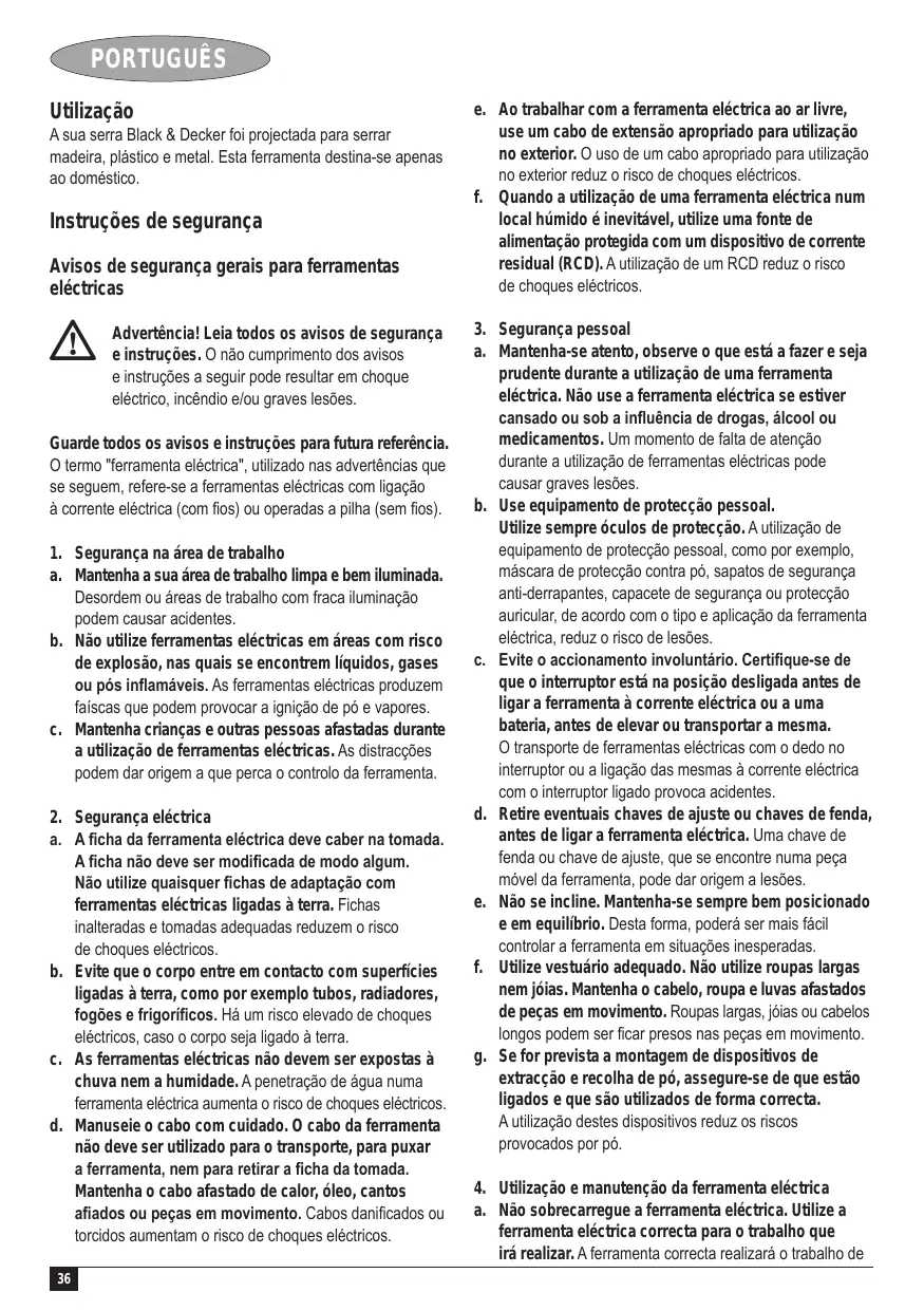 PORTUGUÊS Utilização A sua serra Black & Decker foi projectada para serrar madeira, plástico e metal. Esta ferramenta destina-se apenas ao doméstico. Instruções de segurança Avisos de segurança gerais para ferramentas eléctricas