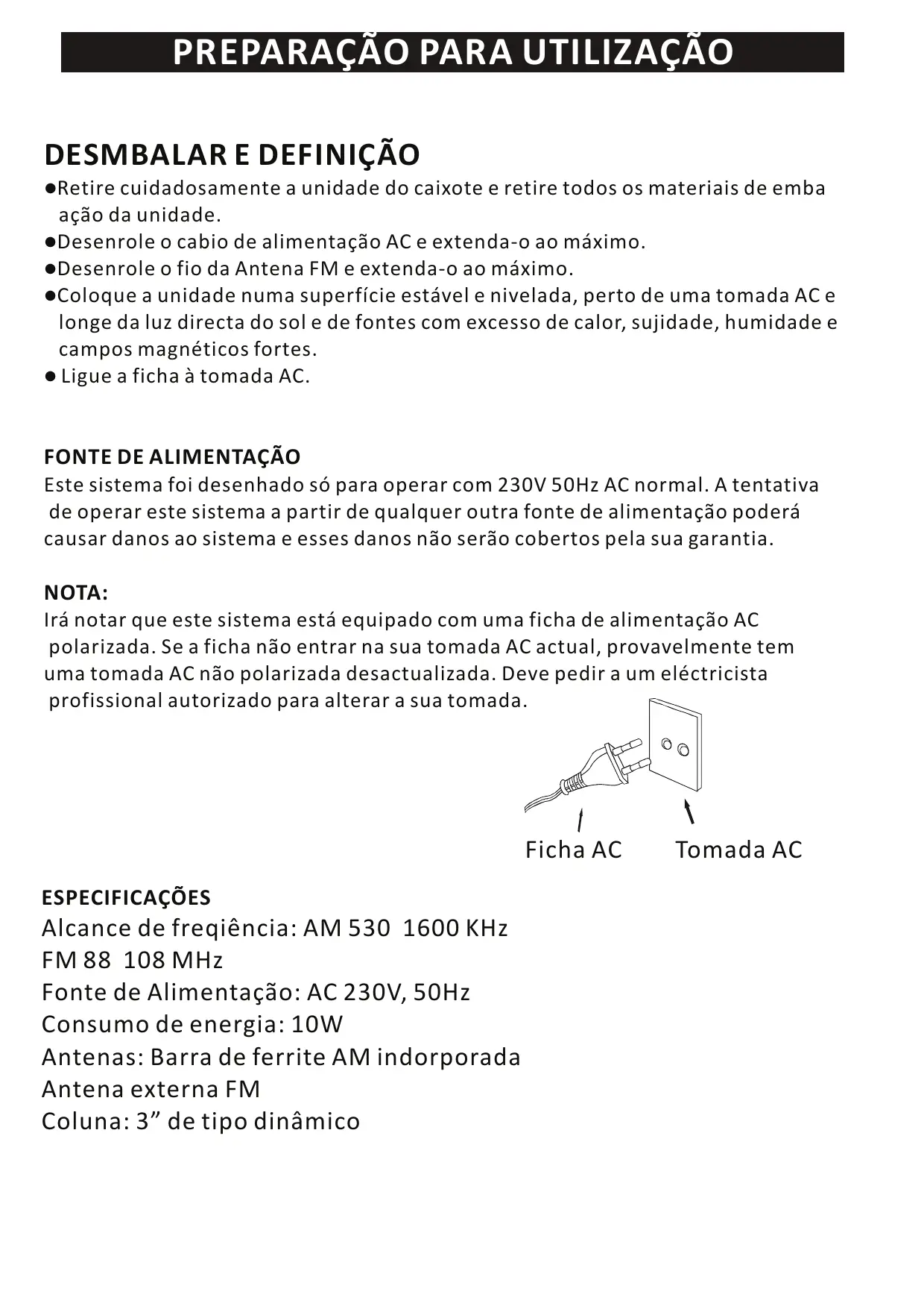 Este sistema foi desenhado só para operar com 230V 50Hz AC normal. A tentativa de operar este sistema a partir de qualquer outra fonte de alimentação poderá causar danos ao sistema e esses danos não serão cobertos pela sua garantia. NOTA: Irá notar que este sistema está equipado com uma ficha de alimentação AC polarizada. Se a ficha não entrar na sua tomada AC actual, provavelmente tem uma tomada AC não polarizada desactualizada. Deve pedir a um eléctricista profissional autorizado para alterar a sua tomada. Ficha AC ESPECIFICAÇÕES Alcance de freqiência: AM 530 1600 KHz FM 88 108 MHz Fonte de Alimentação: AC 230V, 50Hz Consumo de energia: 10W Antenas: Barra de ferrite AM indorporada Antena externa FM Coluna: 3” de tipo dinâmico Tomada AC