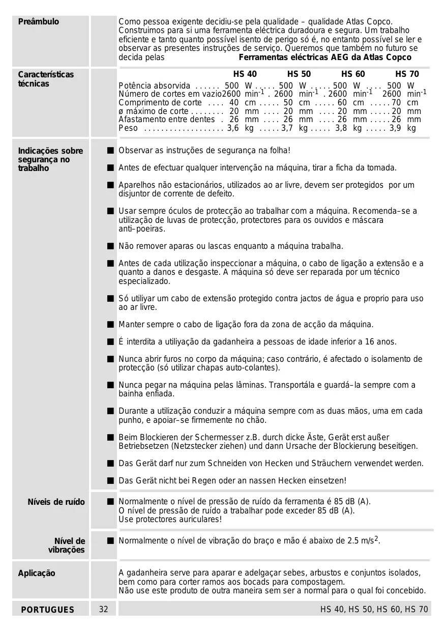 | PORTUGUES | 32 | HS 40, HS 50, HS 60, HS 70 | ||||