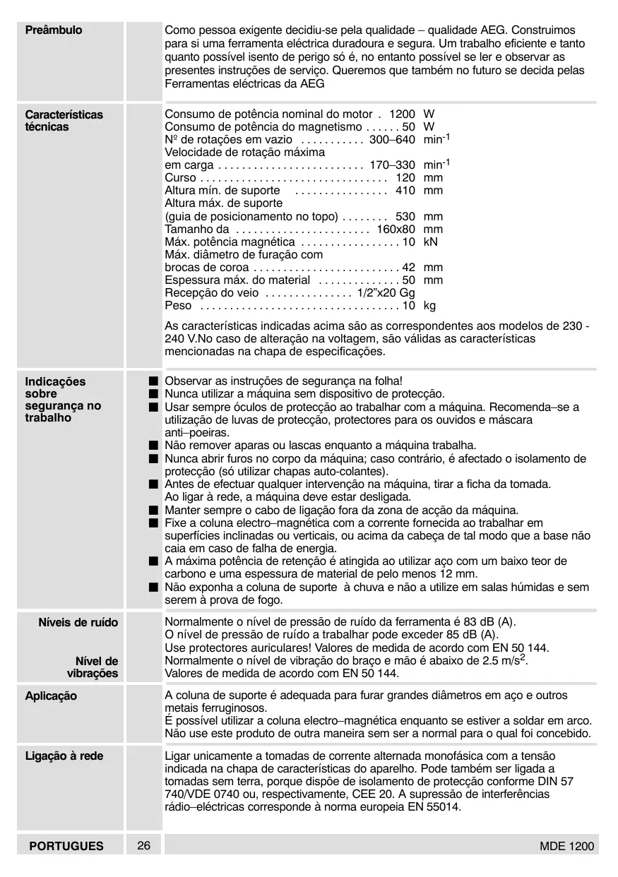 - MDE 1200 Preâmbulo Como pessoa exigente decidiu-se pela qualidade – qualidade AEG. Construimos para si uma ferramenta eléctrica duradoura e segura. Um trabalho eficiente e tanto quanto possível isento de perigo só é, no entanto possível se ler e observar as presentes instruções de serviço. Queremos que também no futuro se decida pelas Ferramentas eléctricas da AEG Características técnicas Consumo de potência nominal do motor . 1200 Consumo de potência do magnetismo p. 50
