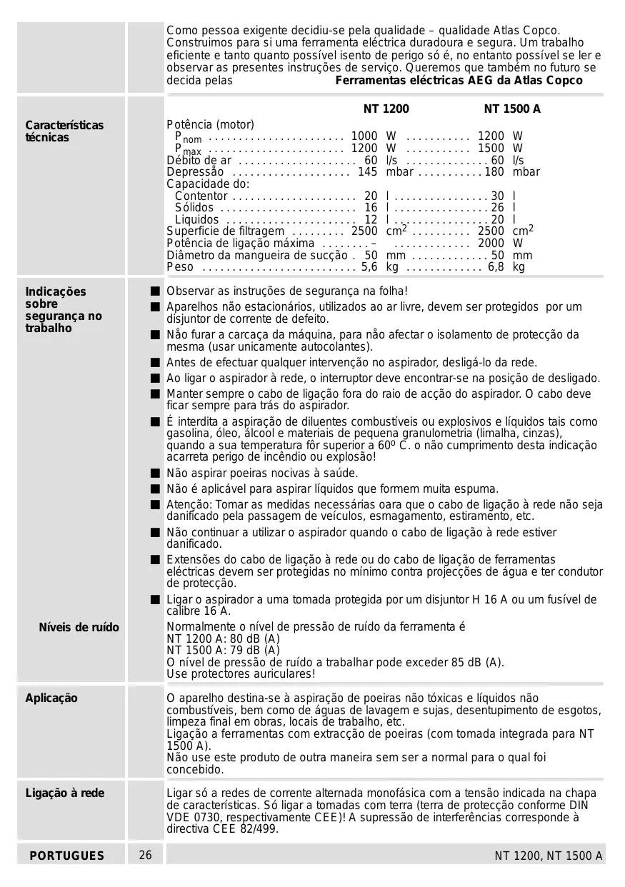 - NT 1200, NT 1500 A Como pessoa exigente decidiu-se pela qualidade – qualidade Atlas Copco. Construimos para si uma ferramenta eléctrica duradoura e segura. Um trabalho eficiente e tanto quanto possível isento de perigo só é, no entanto possível se ler e observar as presentes instruções de serviço. Queremos que também no futuro se decida pelas Ferramentas eléctricas AEG da Atlas Copco NT 1200 NT 1500 A Potência (motor) Pnom p. 1000