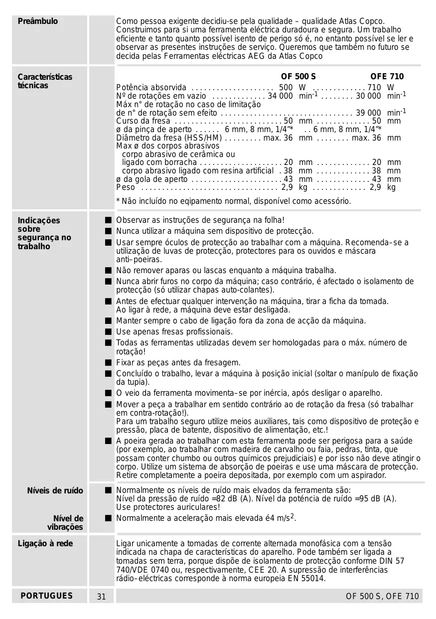 - Preâmbulo Como pessoa exigente decidiu-se pela qualidade – qualidade Atlas Copco. Construimos para si uma ferramenta eléctrica duradoura e segura. Um trabalho eficiente e tanto quanto possível isento de perigo só é, no entanto possível se ler e observar as presentes instruções de serviço. Queremos que também no futuro se decida pelas Ferramentas eléctricas AEG da Atlas Copco Características técnicas OF 500 S OFE 710 Potência absorvida p. 500