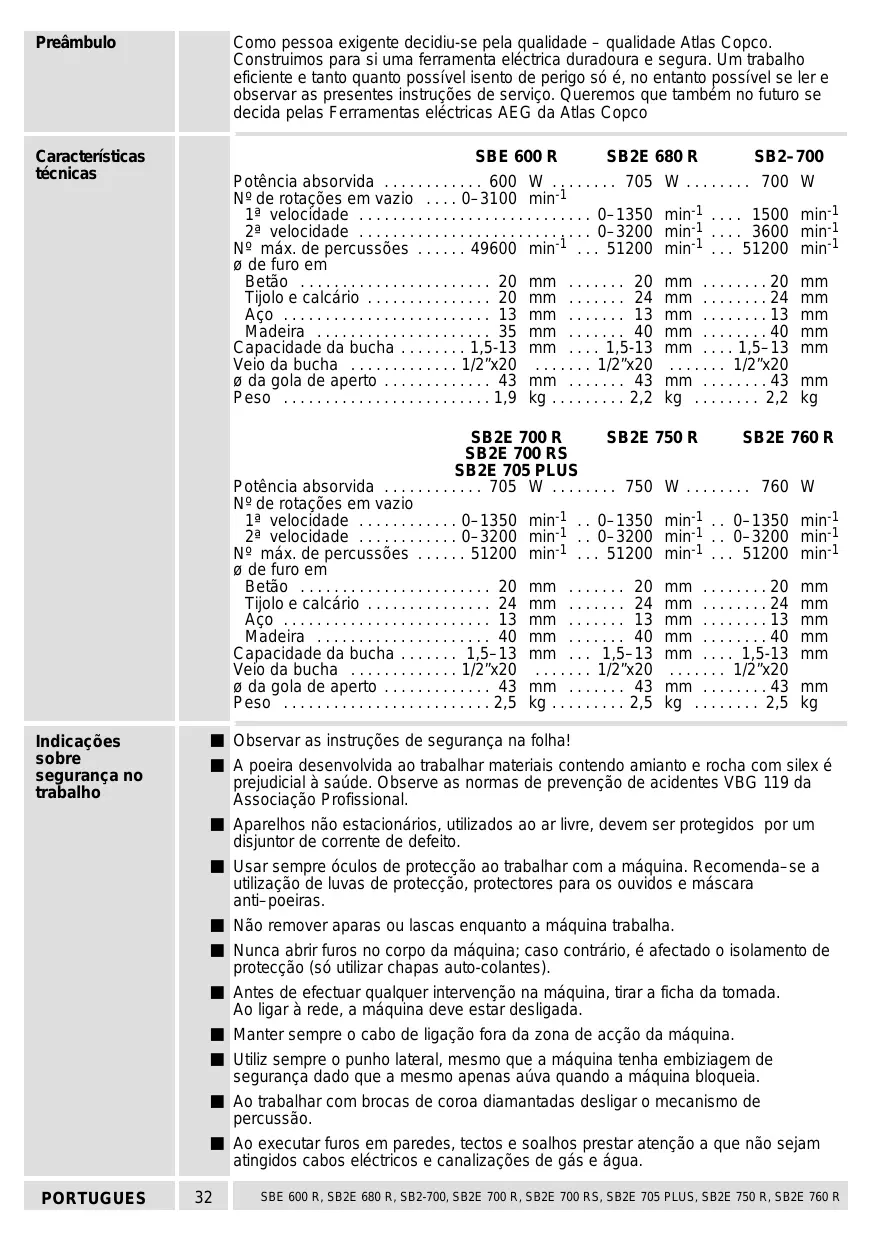 SBE 600 R, SB2E 680 R, SB2-700, SB2E 700 R, SB2E 700 RS, SB2E 705 PLUS, SB2E 750 R, SB2E 760 R Compartimento de ”bits” (não nos SB2–700) Para abrir o compartimento de ”bits” meter o dedo indicador na reentrância, como mostra a figura, e puxar a tampa no sentido do veio da máquina. No compartimento de ”bits” há espaço para seis ”bits” de fenda no máximo. Sugestõrs para operação Conselhos para furar pedra Extrair de tempos a tempos broca do furo para remover o pó. Para furar betão, tijolo duro, pedra, cimento duro ou mármore comutar para percussão. (Para apontar furos em mármore nao usar percussão.) Para furar azulejos, mosaicos, tijolo normal, blocos de escória e reboco comutar para furar. Usar brocas de metal duro. Para furar superfícies lisas (por ex. mosaicos) colar fita adesiva no local do furo para evitar o escorregar da broca. Marcar com um punção o local do furo. Chapas devem ser sempre fixadas. Nos metais finos colocar por baixo um bloco de madeira para evitar deformações. Utilizar brocas espirais HSS (para ferro fundido branco utilizar pontas especiais de metal duro). No caso de grandes ø de furo fazer primeiro um furo com broca com menor diâmetro. Utilizar lubrificantes: - aço: óleo - alumínio: terpentina, parafina - latão, cobre, ferro fundido: não utilizar lubrificante (extrair frequentemente a broca do furo, para arrefecer). Conselhos para furar metal Marcar o local do furo com um punção ou um prego. Para evitar o estilhaçar ao sair da madeira, colocar por baixo um bocado de madeira ou furar de ambos os lados. Conselhos para furos em madeira Conselhos para aparafusar Utilizar ”bits” de fenda de forma e tamanho apropriados. Em madeira macia podem aparafusar-se parafusos apropriados sem furo prévio. Em madeira dura ou no caso de grandes ø de parafuso executar um furo prévio. Nos parafusos de cabeca embebida rebaixar o furo. Nos parafusos para madeira com parte lisa executar um furo prévio com cerca metade do comprimento do parafuso. Manutenção Manter desobstruidos os rasgos de ventilação na carcaça da máquina. Se a máquina for principalmente usada para furação com percussão, remova com regularidade a poeira acumulada na bucha. Para remover a poeira segure a máquina com a bucha a apontar para baixo verticalmente, e abra e feche completamente a bucha. A poeira acumulada irá cair da bucha. É recomendável usar regularmente um dispositivo de limpeza (ref. n°. 4932 6217 19). Para as garras de aperto e para as limalhas das mesmas. De modo a garantir uma aptidão constante de operação, deve–se verificar se as escovas de carvão da máquina estão danificadas num dos centros de assistência técnica AEG. Utilizar unicamente acessórios e peças sobresselentes da AEG. Sempre que a substituição de um componente não tenha sido descrita nas instruções, será de toda a conveniência mandar executar esse trabalho a um Serviço de Assistência AEG (veja o folheto Garantia/Endereços de Serviços de Assistência). A pedido e mediante indicação da referência de dez números que consta da chapa de características da máquina, pode requerer–se um desenho explosivo da ferramenta eléctrica a: Atlas Copco Electric Tools GmbH, Postfach 320, D–71361 Winnenden. Veja nos nossos catálogos o grande número de acessórios com os respectivos números de encomenda. Acessórios PORTUGUES