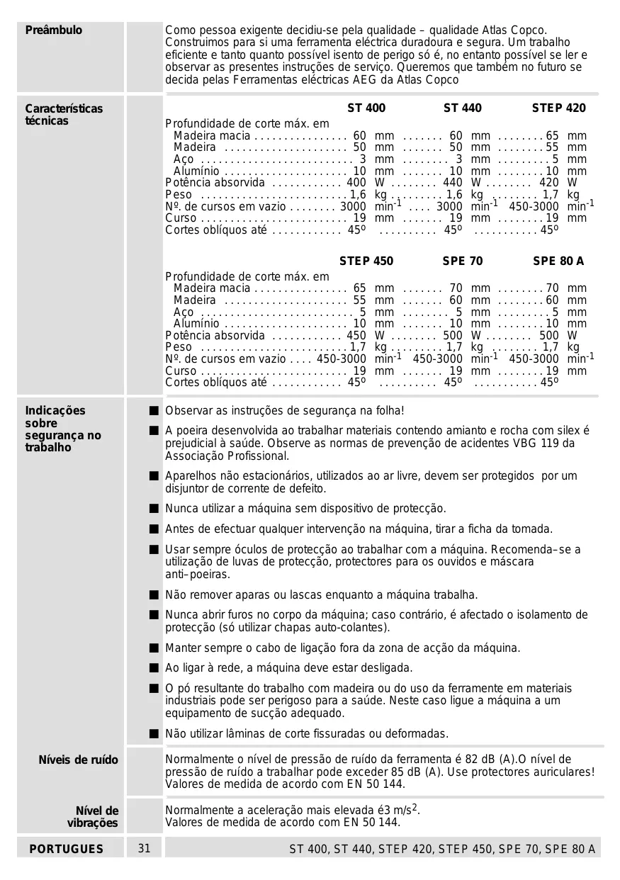- ST 400, ST 440, STEP 420, STEP 450, SPE 70, SPE 80 A Preâmbulo Como pessoa exigente decidiu-se pela qualidade – qualidade Atlas Copco. Construimos para si uma ferramenta eléctrica duradoura e segura. Um trabalho eficiente e tanto quanto possível isento de perigo só é, no entanto possível se ler e observar as presentes instruções de serviço. Queremos que também no futuro se decida pelas Ferramentas eléctricas AEG da Atlas Copco Características técnicas ST 400 ST 440 STEP 420 Profundidade de corte máx. em Madeira macia p. 60