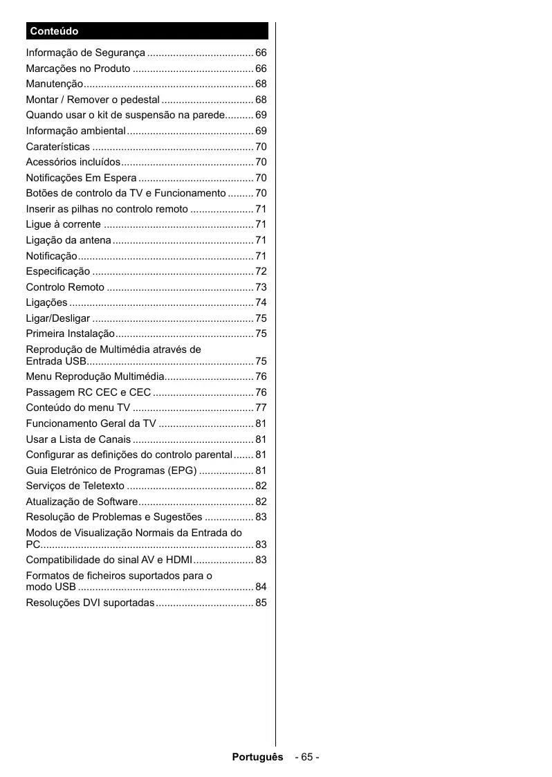 - Reprodução de Multimédia através de Entrada USB p. 75