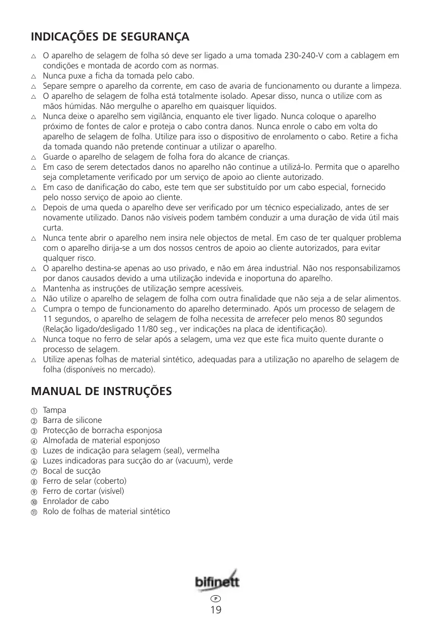 INDICAÇÕES DE SEGURANÇA O aparelho de selagem de folha só deve ser ligado a uma tomada 230-240-V com a cablagem em condições e montada de acordo com as normas. Nunca puxe a ficha da tomada pelo cabo. Separe sempre o aparelho da corrente, em caso de avaria de funcionamento ou durante a limpeza. O aparelho de selagem de folha está totalmente isolado. Apesar disso, nunca o utilize com as mãos húmidas. Não mergulhe o aparelho em quaisquer líquidos. Nunca deixe o aparelho sem vigilância, enquanto ele tiver ligado. Nunca coloque o aparelho próximo de fontes de calor e proteja o cabo contra danos. Nunca enrole o cabo em volta do aparelho de selagem de folha. Utilize para isso o dispositivo de enrolamento o cabo. Retire a ficha da tomada quando não pretende continuar a utilizar o aparelho. Guarde o aparelho de selagem de folha fora do alcance de crianças. Em caso de serem detectados danos no aparelho não continue a utilizá-lo. Permita que o aparelho seja completamente verificado por um serviço de apoio ao cliente autorizado. Em caso de danificação do cabo, este tem que ser substituído por um cabo especial, fornecido pelo nosso serviço de apoio ao cliente. Depois de uma queda o aparelho deve ser verificado por um técnico especializado, antes de ser novamente utilizado. Danos não visíveis podem também conduzir a uma duração de vida útil mais curta. Nunca tente abrir o aparelho nem insira nele objectos de metal. Em caso de ter qualquer problema com o aparelho dirija-se a um dos nossos centros de apoio ao cliente autorizados, para evitar qualquer risco. O aparelho destina-se apenas ao uso privado, e não em área industrial. Não nos responsabilizamos por danos causados devido a uma utilização indevida e inoportuna do aparelho. Mantenha as instruções de utilização sempre acessíveis. Não utilize o aparelho de selagem de folha com outra finalidade que não seja a de selar alimentos. Cumpra o tempo de funcionamento do aparelho determinado. Após um processo de selagem de 11 segundos, o aparelho de selagem de folha necessita de arrefecer pelo menos 80 segundos (Relação ligado/desligado 11/80 seg., ver indicações na placa de identificação). Nunca toque no ferro de selar após a selagem, uma vez que este fica muito quente durante o processo de selagem. Utilize apenas folhas de material sintético, adequadas para a utilização no aparelho de selagem de folha (disponíveis no mercado).