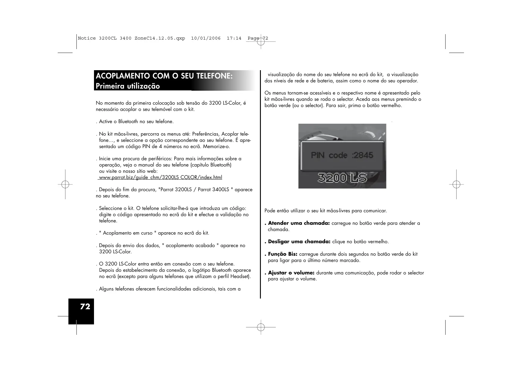 Notice 3200CL 3400 ZoneC14.12.05.qxp 10/01/2006 17:14 Page 72 ACOPLAMENTO COM O SEU TELEFONE: Primeira utilização No momento da primeira colocação sob tensão do 3200 LS-Color, é necessário acoplar o seu telemóvel com o kit. visualização do nome do seu telefone no ecrã do kit, a visualização dos níveis de rede e de bateria, assim como o nome do seu operador. Os menus tornam-se acessíveis e o respectivo nome é apresentado pelo kit mãos-livres quando se roda o selector. Aceda aos menus premindo o botão verde (ou o selector). Para sair, prima o botão vermelho. . Active o Bluetooth no seu telefone. . No kit mãos-livres, percorra os menus até: Preferências, Acoplar telefone…, e seleccione a opção correspondente ao seu telefone. É apresentado um código PIN de 4 números no ecrã. Memorize-o. . Inicie uma procura de periféricos: Para mais informações sobre a operação, veja o manual do seu telefone (capítulo Bluetooth) ou visite o nosso sítio web: www.parrot.biz/guide_chm/3200LS COLOR/index.html . Depois do fim da procura, "Parrot 3200LS / Parrot 3400LS " aparece no seu telefone. . Seleccione o kit. O telefone solicitar-lhe-á que introduza um código: digite o código apresentado no ecrã do kit e efectue a validação no telefone. . " Acoplamento em curso " aparece no ecrã do kit. . Depois do envio dos dados, " acoplamento acabado " aparece no 3200 LS-Color. . O 3200 LS-Color entra então em conexão com o seu telefone. Depois do estabelecimento da conexão, o logótipo Bluetooth aparece no ecrã (excepto para alguns telefones que utilizam o perfil Headset). . Alguns telefones oferecem funcionalidades adicionais, tais com a