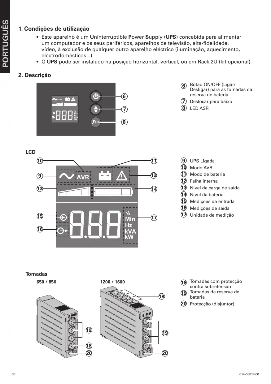 Carregamento da bateria A UPS carrega a sua bateria quando é ligada à rede eléctrica, qualquer que seja o estado do botão 6 . Na primeira utilização, a bateria dispõe de toda a sua autonomia unicamente após uma recarga de 8 horas. Para manter uma autonomia optimizada, convém deixar a UPS ligada em permanência à rede eléctrica. Colocação em funcionamento do UPS Premer o botão 6 durante 1 segundo. Tomadas com protecção contra sobretensão 18 sem reserva de bateria Os aparelhos ligados nestas tomadas são alimentados desde que o cabo de entrada 4 esteja ligado numa tomada de parede. O botão 6 não as controla. Tomadas protegidas 19 Os aparelhos ligados nestas tomadas são alimentados desde que o botão 6 esteja aceso em verde (ver figura D). Estas tomadas podem ser colocadas em funcionamento mesmo se a UPS não estiver ligada à rede eléctrica (botão 6 a piscar).