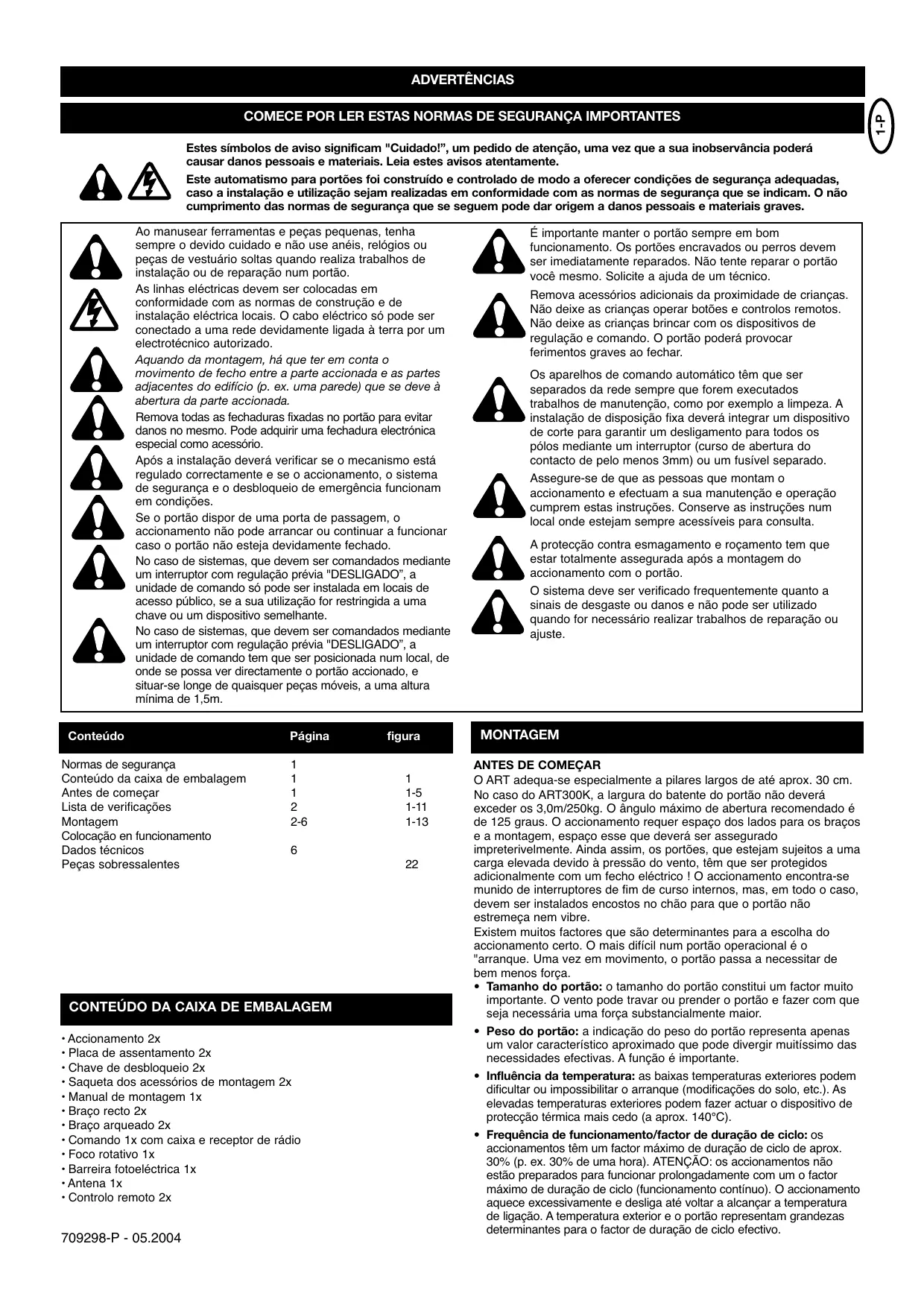 230V-240V/50Hz Antes de começar Lista de verificações Montagem Colocação en funcionamento Dados técnicos Peças sobressalentes Tipo de protecção Largura máx. do portão Peso máx. do portão