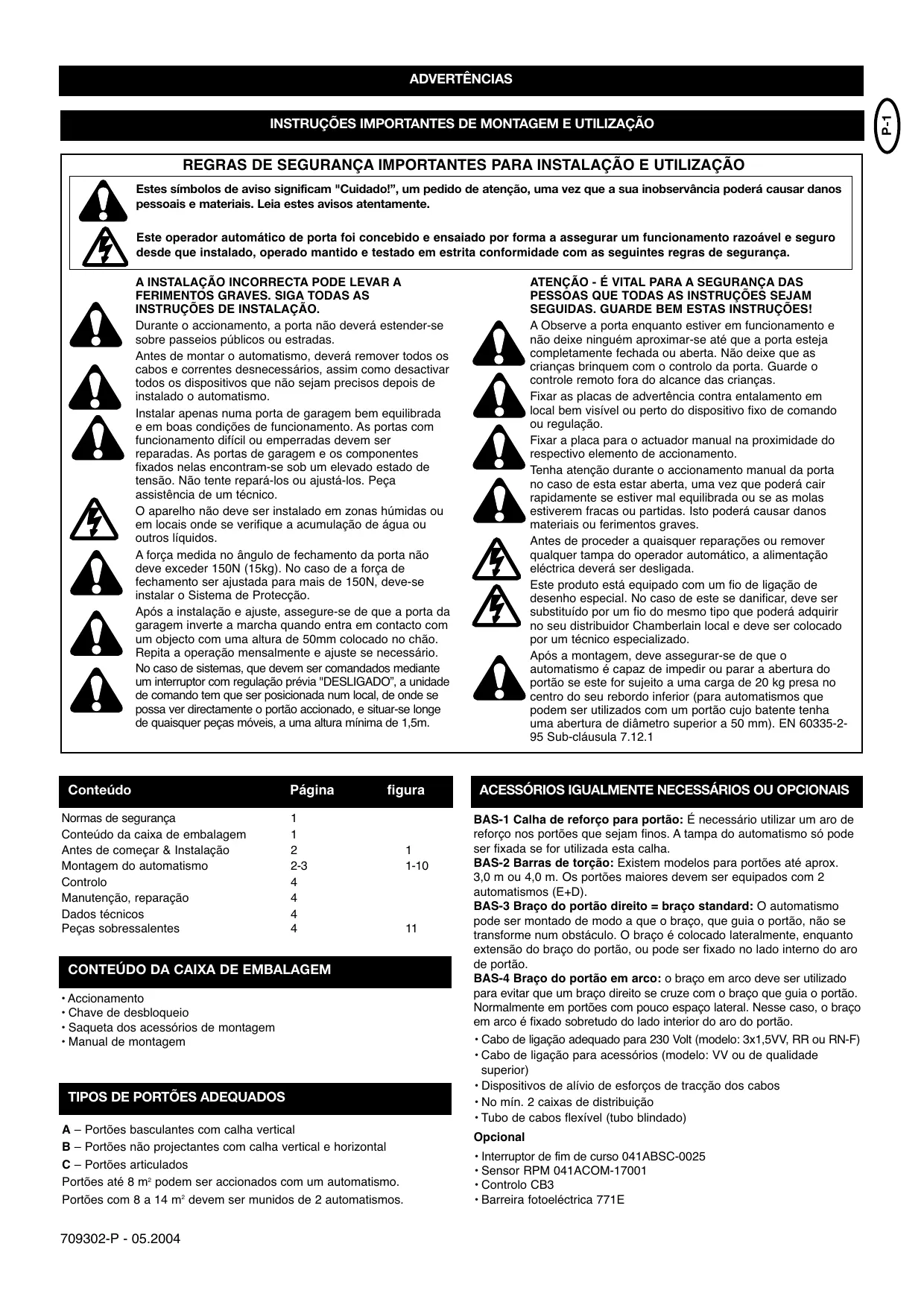 Regulaciones sobre seguridad Contenido de la caja Antes de comenzar & instalación Montaje del automatismo Controles Mantenimiento, reparación Instrucciones de montaje