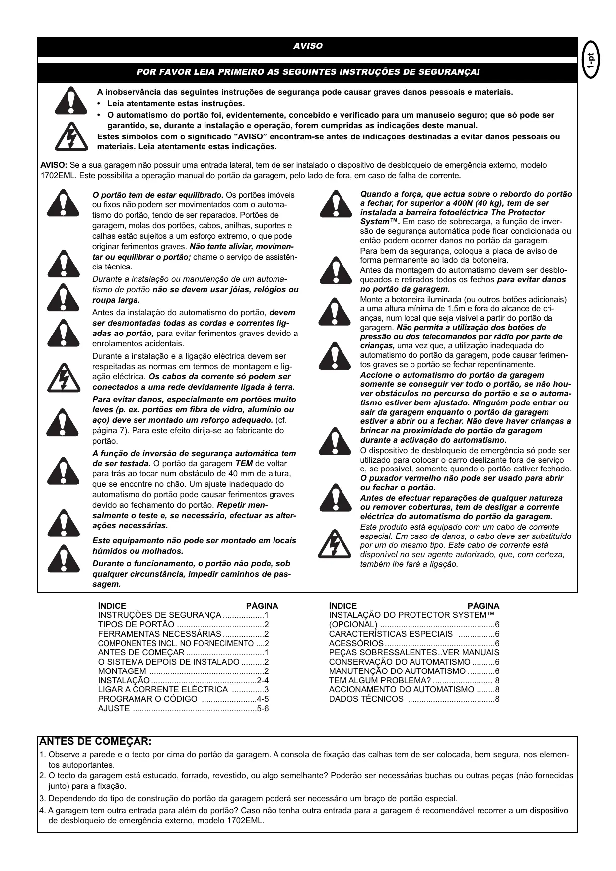 GARANTIA DEL ABRIDOR DE LA PUERTA DE COCHERA POR FAVOR LEIA PRIMEIRO AS SEGUINTES INSTRUÇÕES DE SEGURANÇA! A inobservância das seguintes instruções de segurança pode causar graves danos pessoais e materiais. • Leia atentamente estas instruções. • O automatismo do portão foi, evidentemente, concebido e verificado para um manuseio seguro; que só pode ser garantido, se, durante a instalação e operação, forem cumpridas as indicações deste manual. Estes símbolos com o significado "AVISO” encontram-se antes de indicações destinadas a evitar danos pessoais ou materiais. Leia atentamente estas indicações. AVISO: Se a sua garagem não possuir uma entrada lateral, tem de ser instalado o dispositivo de desbloqueio de emergência externo, modelo 1702EML. Este possibilita a operação manual do portão da garagem, pelo lado de fora, em caso de falha de corrente. O portão tem de estar equilibrado. Os portões imóveis ou fixos não podem ser movimentados com o automatismo do portão, tendo de ser reparados. Portões de garagem, molas dos portões, cabos, anilhas, suportes e calhas estão sujeitos a um esforço extremo, o que pode originar ferimentos graves. Não tente aliviar, movimentar ou equilibrar o portão; chame o serviço de assistência técnica. Durante a instalação ou manutenção de um automatismo de portão não se devem usar jóias, relógios ou roupa larga. Antes da instalação do automatismo do portão, devem ser desmontadas todas as cordas e correntes ligadas ao portão, para evitar ferimentos graves devido a enrolamentos acidentais. Durante a instalação e a ligação eléctrica devem ser respeitadas as normas em termos de montagem e ligação eléctrica. Os cabos da corrente só podem ser conectados a uma rede devidamente ligada à terra. Para evitar danos, especialmente em portões muito leves (p. ex. portões em fibra de vidro, alumínio ou aço) deve ser montado um reforço adequado. (cf. página 7). Para este efeito dirija-se ao fabricante do portão. A função de inversão de segurança automática tem de ser testada. O portão da garagem TEM de voltar para trás ao tocar num obstáculo de 40 mm de altura, que se encontre no chão. Um ajuste inadequado do automatismo do portão pode causar ferimentos graves devido ao fechamento do portão. Repetir mensalmente o teste e, se necessário, efectuar as alterações necessárias. Este equipamento não pode ser montado em locais húmidos ou molhados. Durante o funcionamento, o portão não pode, sob qualquer circunstância, impedir caminhos de passagem. ÍNDICE PÁGINA INSTRUÇÕES DE SEGURANÇA 1 TIPOS DE PORTÃO 2 FERRAMENTAS NECESSÁRIAS 2 COMPONENTES INCL. NO FORNECIMENTO ....2 ANTES DE COMEÇAR 1 O SISTEMA DEPOIS DE INSTALADO 2 MONTAGEM 2 INSTALAÇÃO 2-4 LIGAR A CORRENTE ELÉCTRICA 3 PROGRAMAR O CÓDIGO 4-5 AJUSTE 5-6