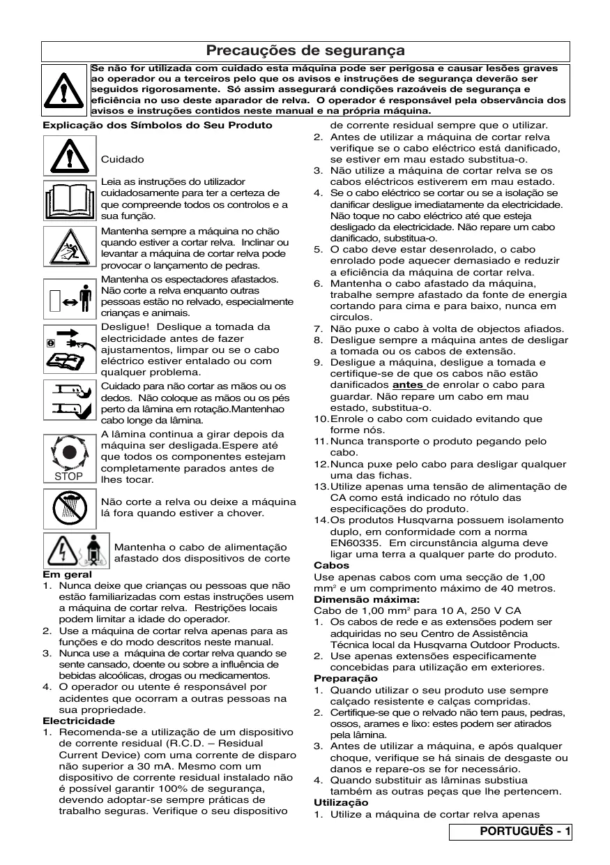 - Atención! Husqvarna Outdoor Products no acepta responsabilidad bajo la garantía por defectos causados total o parcial, directa o indirectamente por el montaje de repuestos o partes adicionales que no sean de manufactura aprobada por Husqvarna Outdoor Products, o si la máquina ha sido modificada en cualquier forma. Precauções de segurança Se não for utilizada com cuidado esta máquina pode ser perigosa e causar lesões graves ao operador ou a terceiros pelo que os avisos e instruções de segurança deverão ser seguidos rigorosamente. Só assim assegurará condições razoáveis de segurança e eficiência no uso deste aparador de relva. O operador é responsável pela observância dos avisos e instruções contidos neste manual e na própria máquina. Explicação dos Símbolos do Seu Produto Cuidado Leia as instruções do utilizador cuidadosamente para ter a certeza de que compreende todos os controlos e a sua função. Mantenha sempre a máquina no chão quando estiver a cortar relva. Inclinar ou levantar a máquina de cortar relva pode provocar o lançamento de pedras. Mantenha os espectadores afastados. Não corte a relva enquanto outras pessoas estão no relvado, especialmente crianças e animais. Desligue! Deslique a tomada da electricidade antes de fazer ajustamentos, limpar ou se o cabo eléctrico estiver entalado ou com qualquer problema. Cuidado para não cortar as mãos ou os dedos. Não coloque as mãos ou os pés perto da lâmina em rotação.Mantenhao cabo longe da lâmina. STOP A lâmina continua a girar depois da máquina ser desligada.Espere até que todos os componentes estejam completamente parados antes de lhes tocar. Não corte a relva ou deixe a máquina lá fora quando estiver a chover. Mantenha o cabo de alimentação afastado dos dispositivos de corte Em geral