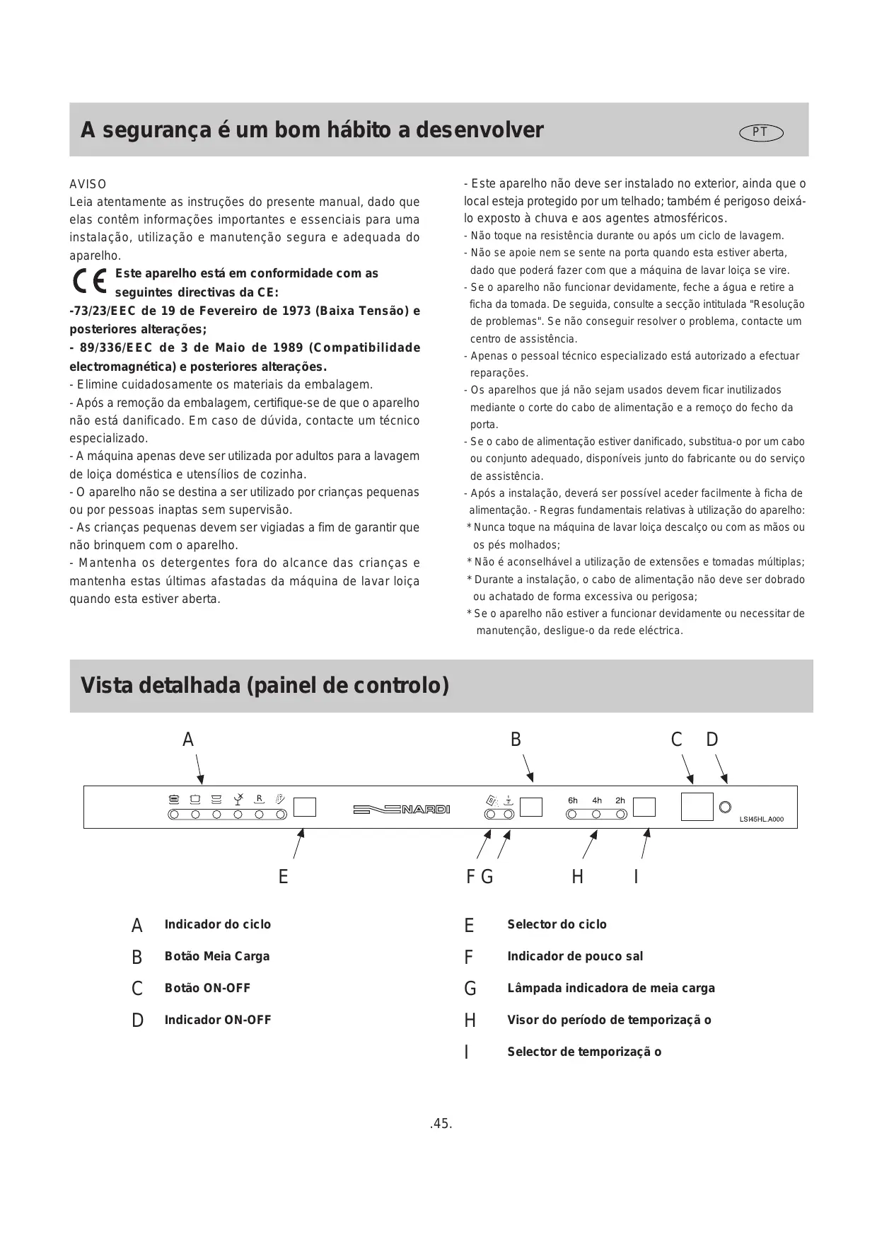 - Este aparelho não deve ser instalado no exterior, ainda que o local esteja protegido por um telhado; também é perigoso deixálo exposto à chuva e aos agentes atmosféricos. AVISO Leia atentamente as instruções do presente manual, dado que elas contêm informações importantes e essenciais para uma instalação, utilização e manutenção segura e adequada do aparelho. Este aparelho está em conformidade com as - Não toque na resistência durante ou após um ciclo de lavagem. - Não se apoie nem se sente na porta quando esta estiver aberta, dado que poderá fazer com que a máquina de lavar loiça se vire. - Se o aparelho não funcionar devidamente, feche a água e retire a seguintes directivas da CE: ficha da tomada. De seguida, consulte a secção intitulada "Resolução -73/23/EEC de 19 de Fevereiro de 1973 (Baixa Tensão) e de problemas". Se não conseguir resolver o problema, contacte um posteriores alterações; centro de assistência. - 89/336/EEC de 3 de Maio de 1989 (Compatibilidade - Apenas o pessoal técnico especializado está autorizado a efectuar electromagnética) e posteriores alterações. - Elimine cuidadosamente os materiais da embalagem. - Após a remoção da embalagem, certifique-se de que o aparelho não está danificado. Em caso de dúvida, contacte um técnico especializado. - A máquina apenas deve ser utilizada por adultos para a lavagem de loiça doméstica e utensílios de cozinha. - O aparelho não se destina a ser utilizado por crianças pequenas ou por pessoas inaptas sem supervisão. - As crianças pequenas devem ser vigiadas a fim de garantir que não brinquem com o aparelho. - Mantenha os detergentes fora do alcance das crianças e mantenha estas últimas afastadas da máquina de lavar loiça quando esta estiver aberta. reparações. - Os aparelhos que já não sejam usados devem ficar inutilizados mediante o corte do cabo de alimentação e a remoço do fecho da porta. - Se o cabo de alimentação estiver danificado, substitua-o por um cabo ou conjunto adequado, disponíveis junto do fabricante ou do serviço de assistência. - Após a instalação, deverá ser possível aceder facilmente à ficha de alimentação. - Regras fundamentais relativas à utilização do aparelho: