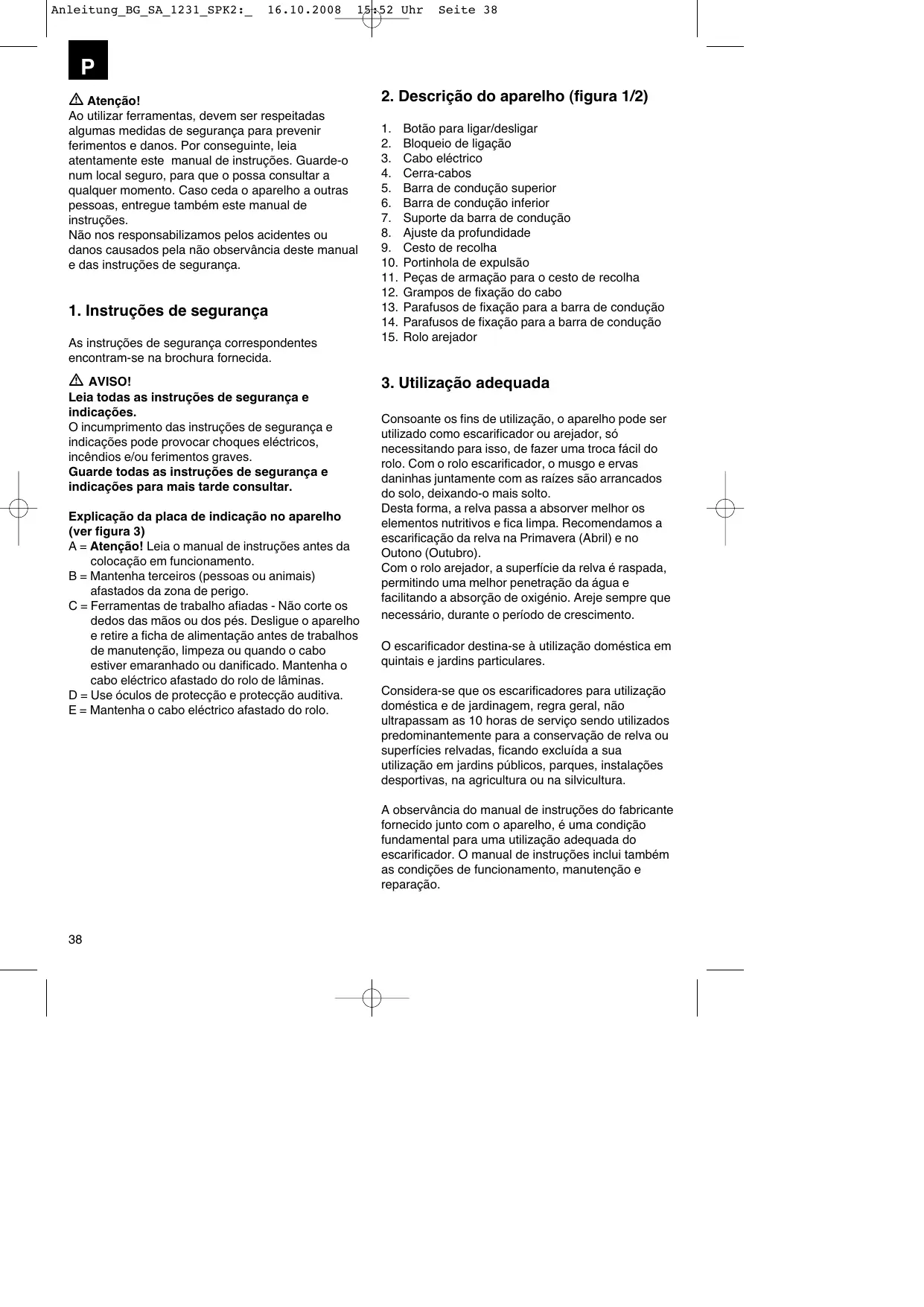Baixe as instruções para o seu Escarificador em formato PDF gratuitamente! Encontre o seu manual BG-SA 1231 - EINHELL e retome o controlo do seu dispositivo eletrónico. Nesta página estão publicados todos os documentos necessários para a utilização do seu dispositivo. BG-SA 1231 da marca EINHELL.