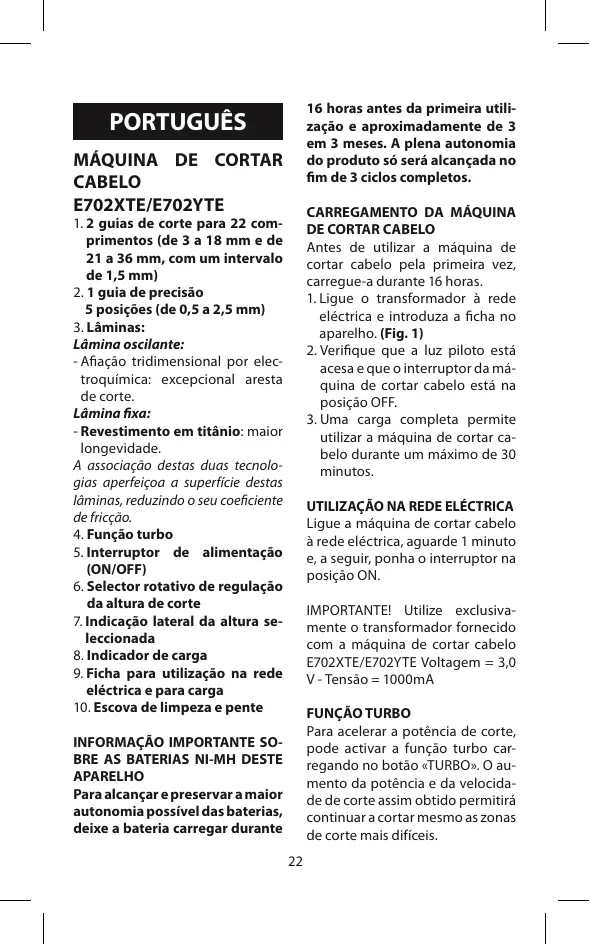 Ligue a máquina de cortar cabelo à rede eléctrica, aguarde 1 minuto e, a seguir, ponha o interruptor na posição ON. IMPORTANTE! Utilize exclusivamente o transformador fornecido com a máquina de cortar cabelo E702XTE/E702YTE Voltagem = 3,0 V - Tensão = 1000mA