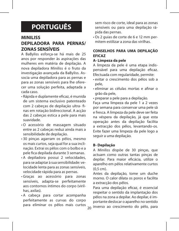 PORTUGUËS MINILISS DEPILADORA PARA PERNAS/ ZONAS SENSIVEIS À BaByliss esforça-se hé mais de 25 anos por responder às aspiraçôes das mulheres em matéria de depilaçäo. À nova depiladora Miniliss o fruto da investigaçäo avançada da BaByliss. As- socia uma depiladora para as pernas e para as zonas sensiveis para Ihe ofere- cer uma soluçäo perfeita, adaptada à cada caso - Répida e duplamente eficaz, munida de um sistema exclusivo patenteado com 2 cabeças de depilaçäo ultra- f- nas em rotaçäo bidireccional. À acçäo das 2 cabeças estica à pele para mais suavidade. +0 acessério de massagem situado entre as 2 cabeças reduz ainda mais à sensibilidade de depilaçäo. +30 pinças agarram os pêlos, mesmo os maïs curtos, seja qual for à sua incli- naçäo. Extrai os pélos com o bolbo e à pele fca depilada durante 3 semanas. +A depiladora possui 2 velocidades, para se adaptar à sua sensibilidade:ve- locidade lent para as zonas sensiveis, velocidade répida para as pernes. +Graças ao acessério para zones sensiveis, adapta-se perfeitamente 205 contomos intimos do corpo (viril- has, axilas). +A cabeça para cortar acompanha perfeitamente as curvas do corpo para eliminar os pélos mais curtos