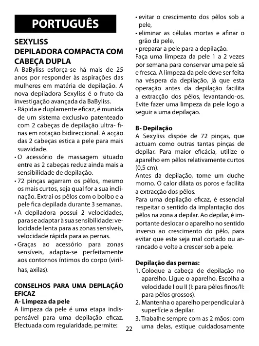 Depilação das pernas: 1. Coloque a cabeça de depilação no aparelho. Ligue o aparelho. Escolha a CONSELHOS PARA UMA DEPILAÇÃO velocidade I ou II (I: para pêlos finos/II: EFICAZ para pêlos grossos). A- Limpeza da pele 2. Mantenha o aparelho perpendicular à A limpeza da pele é uma etapa indissuperfície a depilar. pensável para uma depilação eficaz. 3. Trabalhe sempre com as 2 mãos: com Efectuada com regularidade, permite: 22 uma delas, estique cuidadosamente