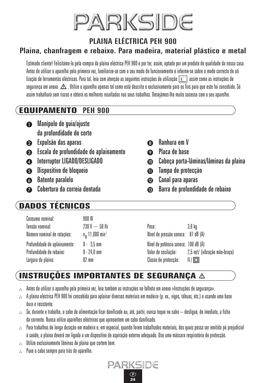 Plaina, chanfragem e rebaixo. Para madeira, material plástico e metal Estimado cliente! Felicitámo-lo pela compra da plaina eléctrica PEH 900 e por ter, assim, optado por um produto de qualidade da nossa casa. Antes de utilizar o aparelho pela primeira vez, familiarize-se com o seu modo de funcionamento e informe-se sobre o modo correcto de uti lização de ferramentas eléctricas. Para tal, leia com atenção as seguintes instruções de utilização assim como as instruções de segurança em anexo . Utilize o aparelho apenas tal como está descrito e exclusivamente para os fins para que este foi concebido. Só assim trabalhará sem riscos e obterá os melhores resultados nos seus trabalhos. Desejámos-lhe muito sucesso com o seu aparelho. EQUIPAMENTO PEH 900
