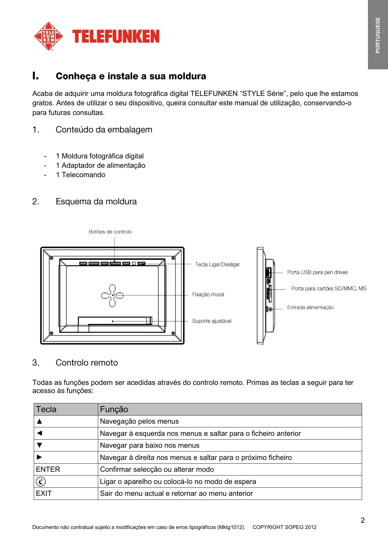 Acaba de adquirir uma moldura fotografia digital TELEFUNKEN "STYLE Série", pelo que Ihe estamos gratos. Antes de utilizes o seu dispositivo, queira consulutar este manual de'utilisation, conservando-o para futuras consulutas.