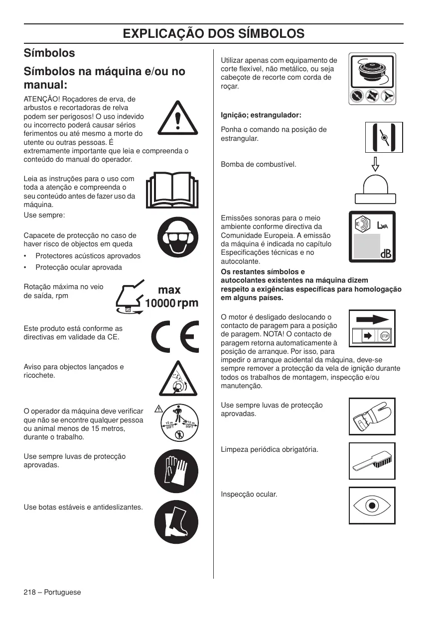 Aviso para objectos lançados e ricochete. Use sempre luvas de protecção aprovadas. Bomba de combustível. O motor é desligado deslocando o contacto de paragem para a posição de paragem. NOTA! O contacto de paragem retorna automaticamente à posição de arranque. Por isso, para impedir o arranque acidental da máquina, deve-se sempre remover a protecção da vela de ignição durante todos os trabalhos de montagem, inspecção e/ou manutenção. Este produto está conforme as directivas em validade da CE. O operador da máquina deve verificar que não se encontre qualquer pessoa ou animal menos de 15 metros, durante o trabalho. Ponha o comando na posição de estrangular. Emissões sonoras para o meio ambiente conforme directiva da Comunidade Europeia. A emissão da máquina é indicada no capítulo Especificações técnicas e no autocolante. Os restantes símbolos e autocolantes existentes na máquina dizem respeito a exigências específicas para homologação em alguns países. Capacete de protecção no caso de haver risco de objectos em queda