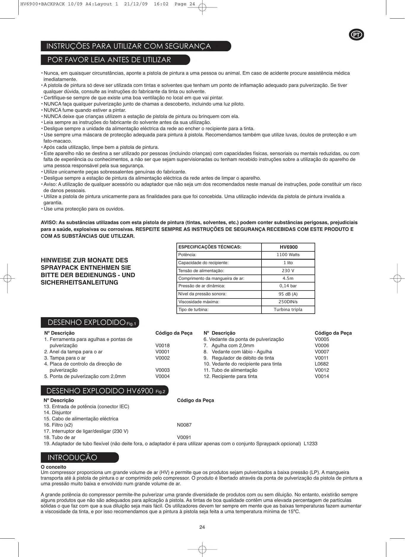 V0091 19. Adaptador de tubo flexível (não deite fora, o adaptador é para utilizar apenas com o conjunto Spraypack opcional) L1233 INTRODUÇÃO O conceito Um compressor proporciona um grande volume de ar (HV) e permite que os produtos sejam pulverizados a baixa pressão (LP). A mangueira transporta até à pistola de pintura o ar comprimido pelo compressor. O produto é libertado através da ponta de pulverização da pistola de pintura a uma pressão muito baixa e envolvido num grande volume de ar. A grande potência do compressor permite-lhe pulverizar uma grande diversidade de produtos com ou sem diluição. No entanto, existirão sempre alguns produtos que não são adequados para aplicação à pistola. As tintas de boa qualidade contêm uma elevada percentagem de partículas sólidas o que faz com que a sua diluição seja mais fácil. Os utilizadores devem ter sempre em mente que as baixas temperaturas fazem aumentar a viscosidade da tinta, e por isso recomendamos que a pintura à pistola seja feita a uma temperatura mínima de 15ºC.