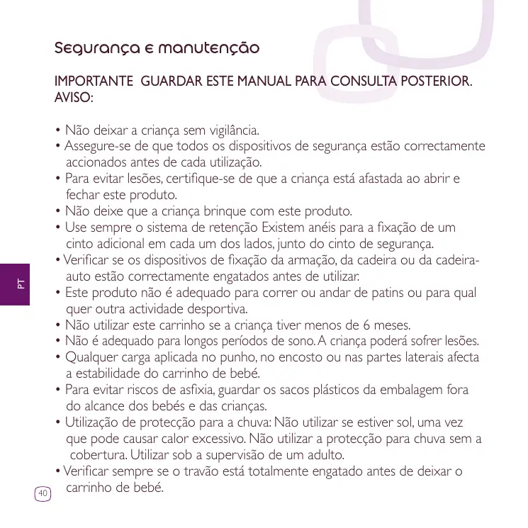 D. Bouton de verrouillage pour le pliage E. Roue arrière F. Réglage du repose-pieds G. Panier H. Roue avant I. Blocage de la roue pivotante (Buzz 3) J. Module de la roue avant (Buzz 3) K. Repose-pieds L. Harnais de sécurité M. Bouton de déver rouillage de l’arceau de maintien N. Arceau de maintien O. Protège-harnais P. Canopy Q. Adaptateurs R. Crochet de transport • Pour éviter toute blessure, maintenir votre enfant à l’écart lors du dépliage et du pliage du produit. • Ne pas laisser votre enfant jouer avec ce produit. • Toujours utiliser le système de retenue. Des anneaux pour la fixation d’un harnais supplémentaire sont situés au niveau de la ceinture de maintien, de chaque côté. • Vérifier que les dispositifs de fixation de la nacelle, du siège ou du siège-auto sont correctement enclenchés avant utilisation. • Ce produit ne convient pas pour faire du jogging ou des promenades en rollers et toutes autres activités sportives. • Ce siège ne convient pas à des enfants de moins de 6 mois • Ne convient pas pour de longue période de sommeil, votre enfant risquer ait d’être en danger. • Le fait d’accrocher une charge au poussoir, dossier ou côtés influe sur la stabilité du landau/de la poussette. • Pour éviter les risques d’étouffement, conservez les sacs plastique de l’emballage hors de portée des bébés et des jeunes enfants. • Utilisation de l’habillage-pluie: Ne pas utiliser en cas de temps ensoleillé, pour cause de chaleur excessive. Ne pas utiliser l’habillage pluie sans la capote. 25
