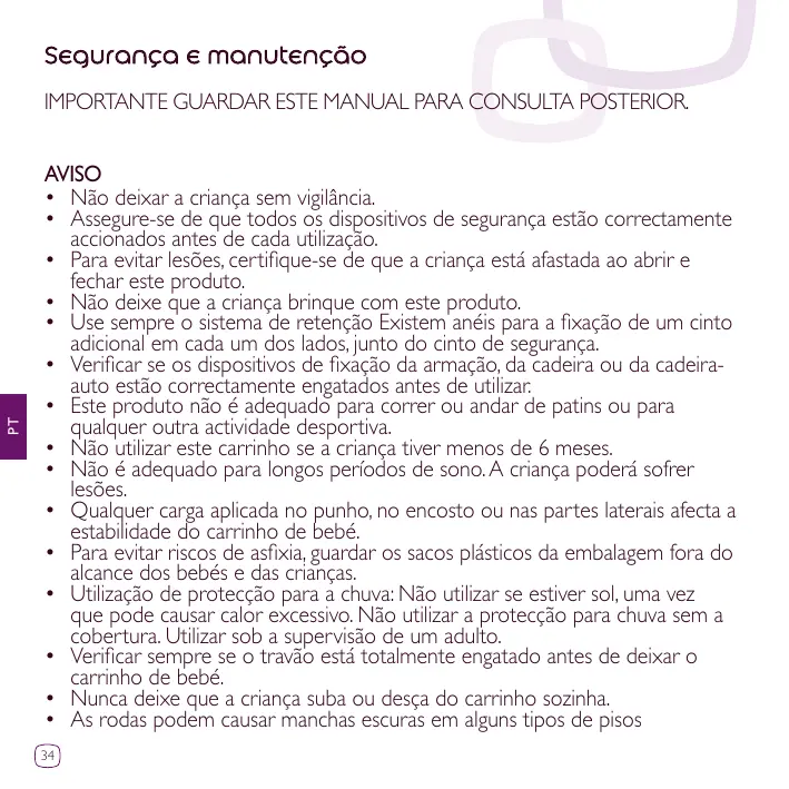 • Pour éviter toute blessure, maintenir votre enfant à l’écart lors du dépliage et du pliage du produit. • Ne pas laisser votre enfant jouer avec ce produit. • Toujours utiliser le système de retenue. Des anneaux pour la fixation d’un harnais supplémentaire sont situés au niveau de la ceinture de maintien, de chaque côté. • Vérifier que les dispositifs de fixation de la nacelle, du siège ou du siège-auto sont correctement enclenchés avant utilisation. • Ne pas utiliser ce produit en faisant du jogging ou des promenades en rollers et toutes autres activités sportives. • Ne pas utiliser ce siège pour des enfants de moins de 6 mois. • Ne convient pas pour de longue période de sommeil, votre enfant risquerait d’être en danger. • Le fait d’accrocher une charge au poussoir, dossier ou côtés influe sur la stabilité du landau/de la poussette. • Pour éviter les risques d’étouffement, conservez les sacs plastique de l’emballage hors de portée des bébés et des jeunes enfants. • Utilisation de l’habillage-pluie: Ne pas utiliser en cas de temps ensoleillé, pour cause de chaleur excessive. Ne pas utiliser l’habillage pluie sans la capote. A utiliser sous la surveillance d’un adulte. • Toujours vérifier que le frein est bien engagé avant de lâcher votre poussette. • Ne jamais laisser votre enfant monter et descendre seul de la poussette. • Les pneus peuvent laisser des traces noires sur certains sols (surtout les sols lisses comme les parquets, les laminés synthétiques, le linoléum, etc.). 19