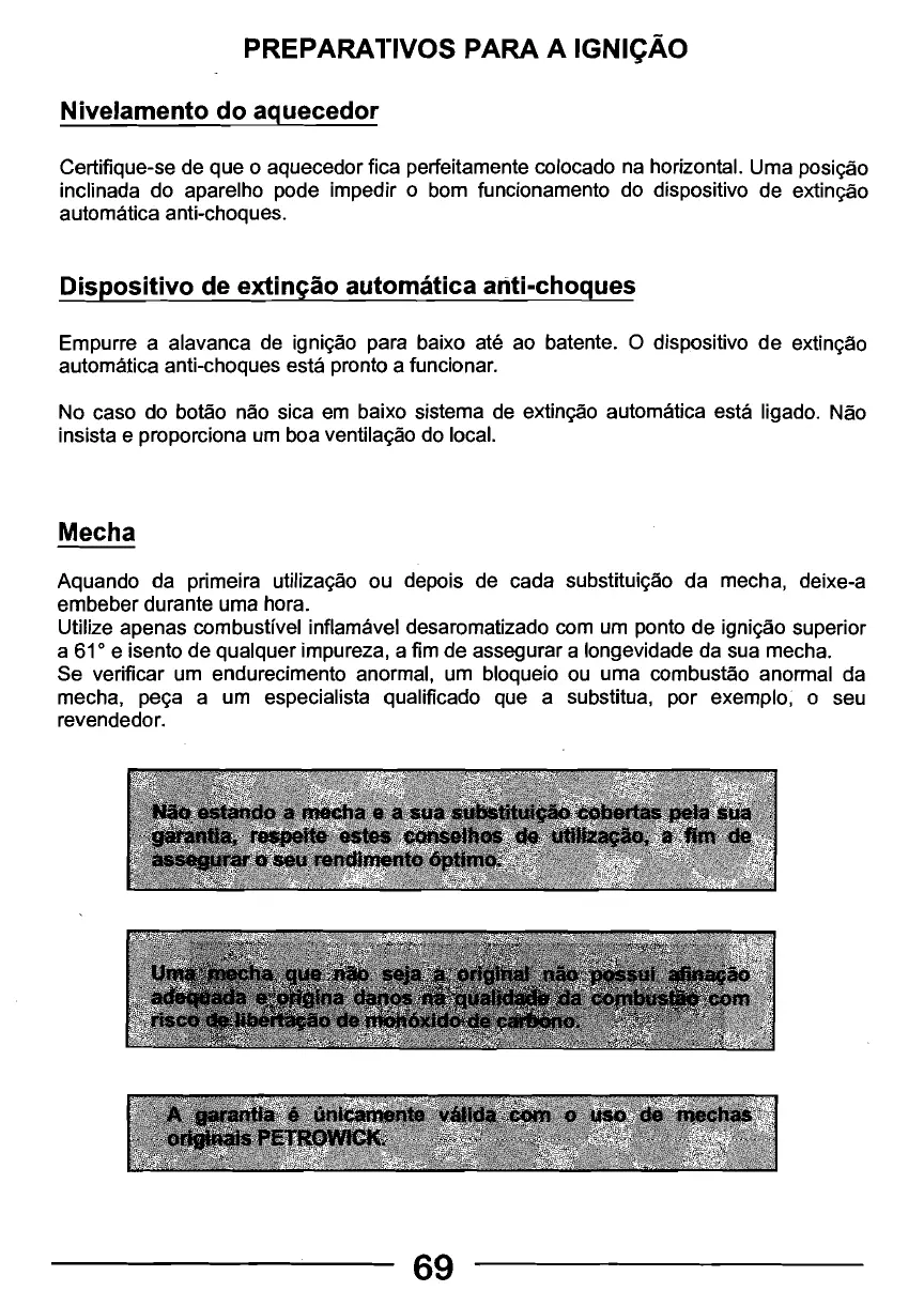 Évitez tout contact avec la grille. Ne jamais allumer votre appareil à l'aide d'allumettes ou autres feux (p. 8) Utilisez uniquement du combustible liquide pour appareils mobiles de chauffage conforme aux arrêtés du 08/01/1998 et du 18/07/2002 (page 10). Nous vous conseillons très fortement l'utilisation de la TOSAINE ou, pour encore moins d'odeurs, de la TOSAINE PLUS, seuls combustibles dont nous garantissons la parfaite adéquation avec votre appareil. (p. 10) La mèche et son remplacement ne sont jamais couverts par votre garantie, lisez attentivement votre notice. (p. 11) Une mèche qui n'est pas d'origine ou marquée NF et qui ne présente pas les réglages d'usine provoque une dégradation de la qualité de la combustion avec risque de dégagement de monoxyde de carbone. La garantie n'est pas valable sans utilisation des mèches PETROWICK ou originales marquées NF. (p. 11) Ne jamais allumer votre appareil à l'aide d'allumettes ou d'un briquet (p. 8 et p. 12) Votre appareil est équipé d'une sécurité atmosphérique AIR SENSOR® basée sur la température de la pièce chauffée. Veillez à une bonne aération de celle-ci. (p. 14) Toute intervention ou modification au système de sécurité est interdite. Outre l'annulation de votre garantie celiés-ci risqueraient d'entraîner une défaillance du système au dépend de votre sécurité (p. 15) Cet appareil de chauffage ne peut jamais être utilisé: Dans des locaux et pièces étanches tels que: caravanes, bateaux, cabines de véhicules etc Sans présence d'un adulte dans l'habitation Avec un quelconque objet posé sur son dessus (pour réchauffer par ex.) En chauffage continu Dans les courants d'air (p. 15) Maintenez toujours une distance de sécurité d'un mètre minimum entre l'appareil et tout objet, meuble ou mur (p. 15) Utilisez votre appareil dans une pièce suffisamment ventilée et exempte de vapeurs inflammables (p.15) Chaque pièce où l'appareil est utilisé, doit être munie d'une entrée d'air suffisante et d'une sortie d'air efficace (section minimale de 50 cm2 pour chaque orifice (p. 15) N'utilisez pas votre appareil dans une pièce sous dimensionnée (p. 15): Foyer de 2400 W : > 37 m3 Foyer de 3000 W : > 46 m3 (p. 15) N'utilisez pas votre appareil dans des pièces situées en dessous du niveau du sol (p. 15)
