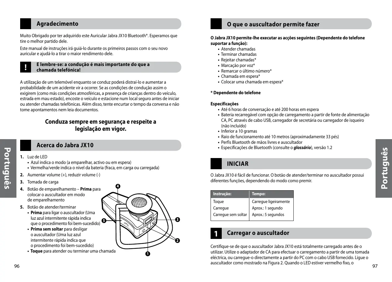 O que o auscultador permite fazer O Jabra JX10 permite-lhe executar as acções seguintes (Dependente do telefone suportar a função): • Atender chamadas • Terminar chamadas • Rejeitar chamadas* • Marcação por voz* • Remarcar o último número* • Chamada em espera* • Colocar uma chamada em espera* * Dependente do telefone Especificações • Até 6 horas de conversação e até 200 horas em espera • Bateria recarregável com opção de carregamento a partir de fonte de alimentação CA, PC através de cabo USB, carregador de secretária ou carregador de isqueiro (não incluído) • Inferior a 10 gramas • Raio de funcionamento até 10 metros (aproximadamente 33 pés) • Perfis Bluetooth de mãos livres e auscultador • Especificações de Bluetooth (consulte o glossário), versão 1.2