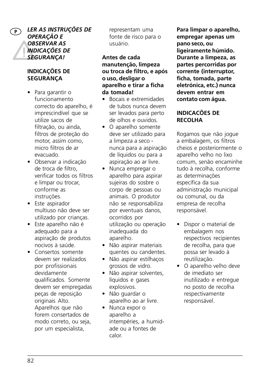 • Respecter l'affichage pour le changement du sac, contrôler tous les filtres et les nettoyer ou les échanger selon la notice d'emploi. • Cet aspirateur Combi n'est pas un appareil de travail conçu pour les enfants. • Cet appareil n'est pas conçu pour l'aspiration de matières nuisibles à la santé. • Seules les personnes qualifiées peuvent procéder aux réparations. • Seules les pièces de rechange originales Alto peuvent être employées à cet effet. Tout appareil non réparé par une personne qualifiée constitue un danger pour l'utilisateur. 12