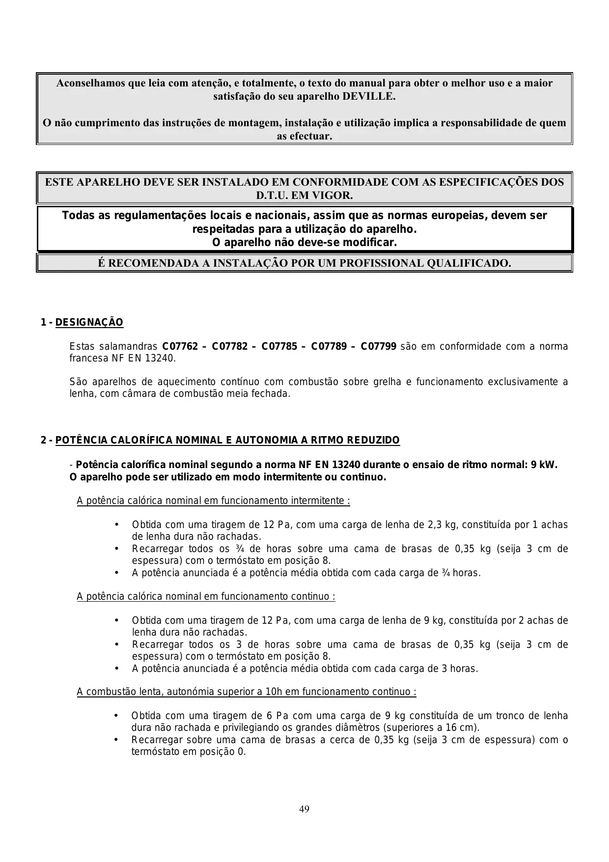 Estas salamandras C07762 – C07782 – C07785 – C07789 – C07799 são em conformidade com a norma francesa NF EN 13240. São aparelhos de aquecimento contínuo com combustão sobre grelha e funcionamento exclusivamente a lenha, com câmara de combustão meia fechada.