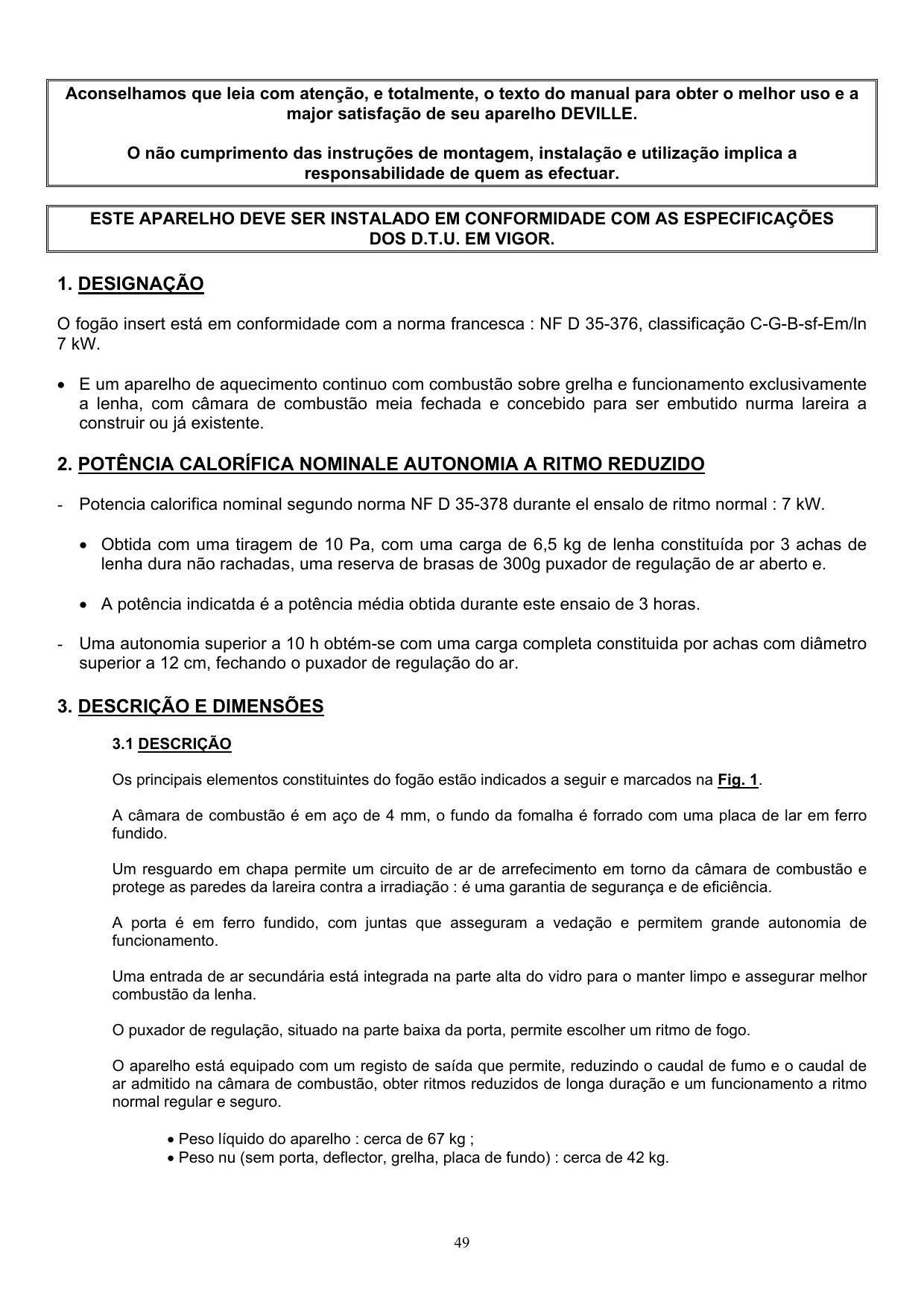 Aconselhamos que leia com atenção, e totalmente, o texto do manual para obter o melhor uso e a major satisfação de seu aparelho DEVILLE. O não cumprimento das instruções de montagem, instalação e utilização implica a responsabilidade de quem as efectuar. ESTE APARELHO DEVE SER INSTALADO EM CONFORMIDADE COM AS ESPECIFICAÇÕES DOS D.T.U. EM VIGOR.