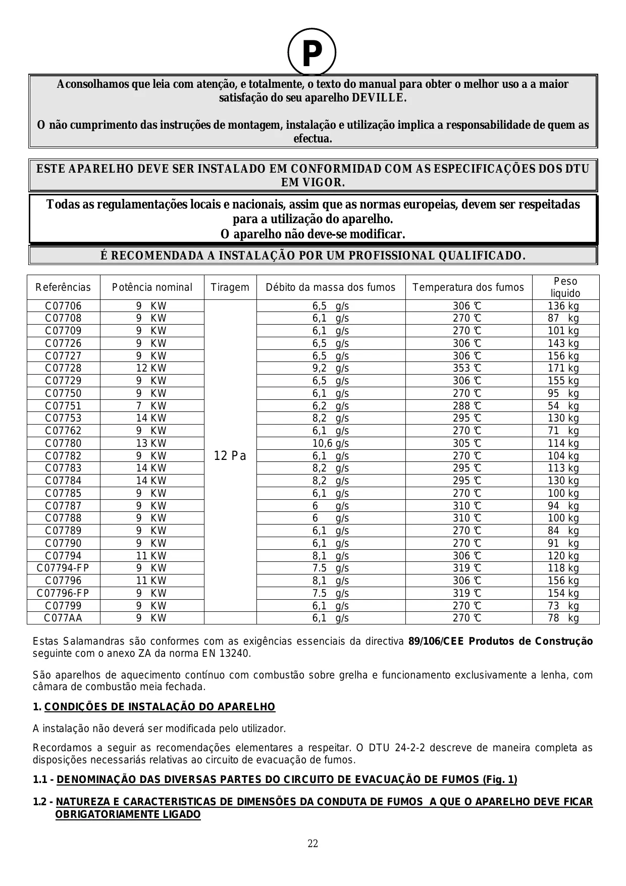 L’appareil ne doit pas être modifié. L’INSTALLATION PAR UN PROFESSIONNEL QUALIFIE EST RECOMMANDEE. Référence C07706 C07708 1. CONDITIONS D’INSTALLATION DE L’APPAREIL L'installation ne devra pas être modifiée par l'utilisateur. Nous rappelons ci-après les recommandations élémentaires à respecter. Le DTU 24-2-2 décrit de façon complète les dispositions nécessaires concernant le circuit d’évacuation des fumées. 1.1 - DöNOMINATION DES DIVERSES PARTIES DU CIRCUIT D'öVACUATION DES FUMöES (Fig. 1) 1.2 - NATURE ET CARACTöRISTIQUES DIMENSIONNELLES DU CONDUIT DE FUMöE AUQUEL DOIT ÊTRE OBLIGATOIREMENT RACCORDö L'APPAREIL 1.2.1 Nature du conduit de fumée 2