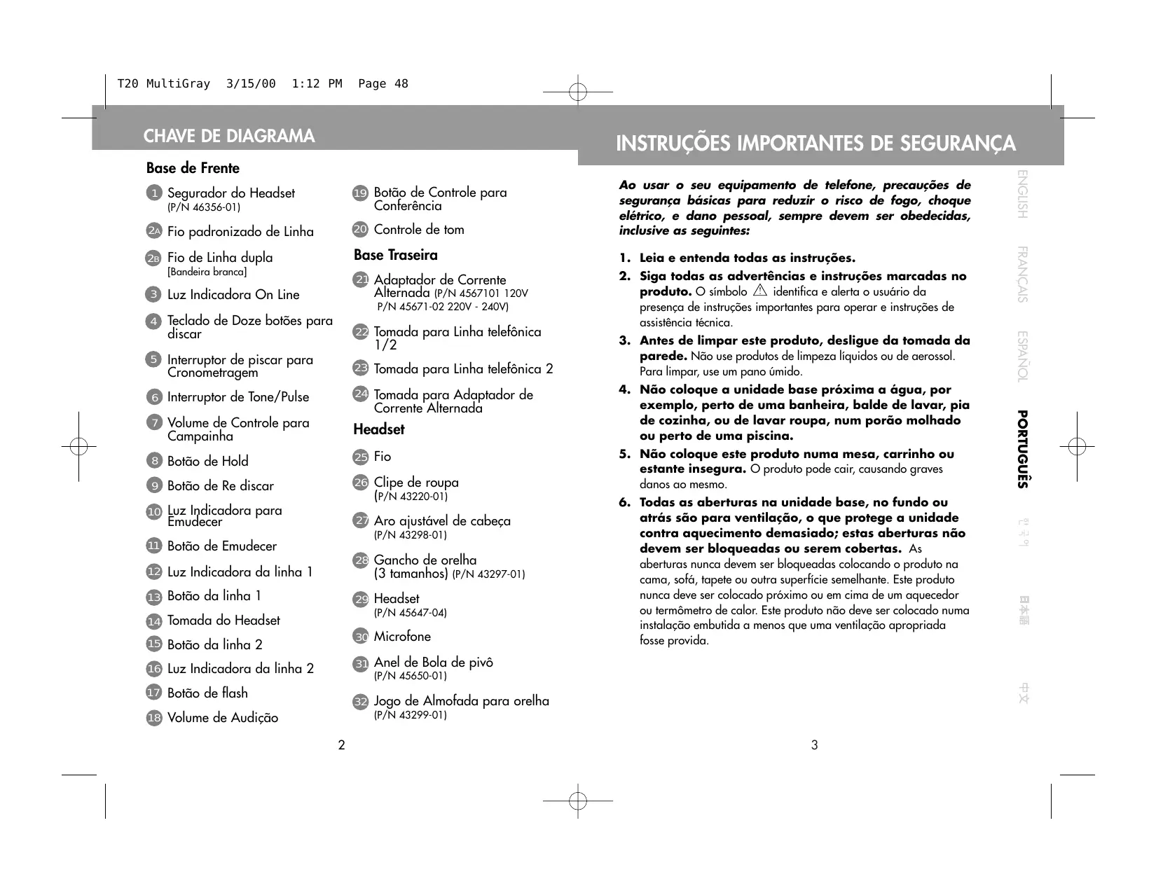 parede. Não use produtos de limpeza líquidos ou de aerossol. Para limpar, use um pano úmido. ESPAÑOL 22 Tomada para Linha telefônica discar FRANÇAIS 2A Fio padronizado de Linha 20 Controle de tom Ao usar o seu equipamento de telefone, precauções de segurança básicas para reduzir o risco de fogo, choque elétrico, e dano pessoal, sempre devem ser obedecidas, inclusive as seguintes: 19 Botão de Controle para 1 Segurador do Headset ENGLISH Base de Frente 31 Anel de Bola de pivô 16 Luz Indicadora da linha 2 CHINESE (P/N 45650-01) 17 Botão de flash 32 Jogo de Almofada para orelha (P/N 43299-01) 18 Volume de Audição