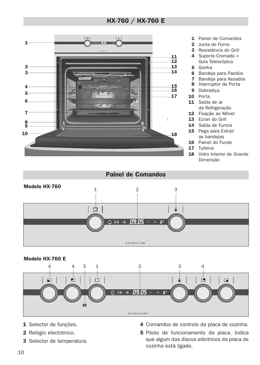 Painel de Comandos Junta do Forno Resistência do Grill Suporte Cromado + Guía Telescópica Grelha Bandeja para Pastéis Bandeja para Assados Interruptor de Porta Dobradiça Porta Saída de ar da Refrigeração Fixação ao Móvel Ecran do Grill Saída de Fumos Pega para Extrair as bandejas Painel do Fundo Turbina Vidro Interior de Grande Dimensão Painel de Comandos Modelo HX-760