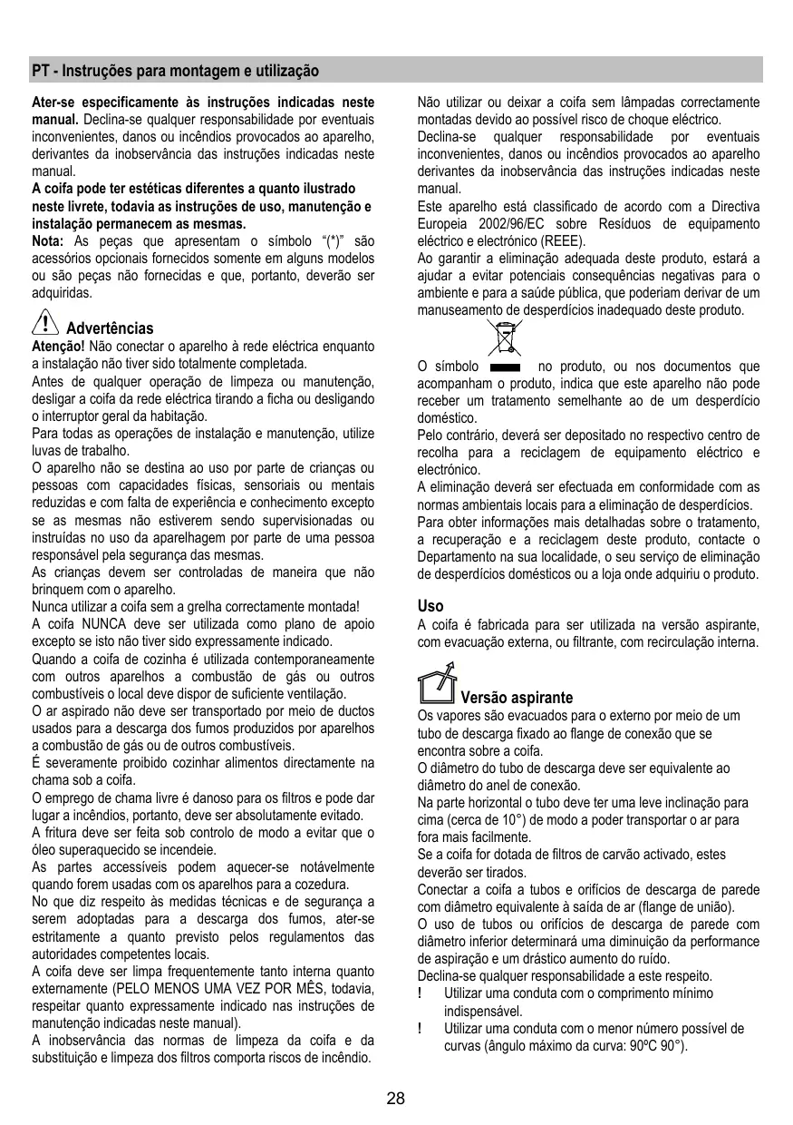 Não utilizar ou deixar a coifa sem lâmpadas correctamente montadas devido ao possível risco de choque eléctrico. Declina-se qualquer responsabilidade por eventuais inconvenientes, danos ou incêndios provocados ao aparelho derivantes da inobservância das instruções indicadas neste manual. Este aparelho está classificado de acordo com a Directiva Europeia 2002/96/EC sobre Resíduos de equipamento eléctrico e electrónico (REEE). Ao garantir a eliminação adequada deste produto, estará a ajudar a evitar potenciais consequências negativas para o ambiente e para a saúde pública, que poderiam derivar de um manuseamento de desperdícios inadequado deste produto.