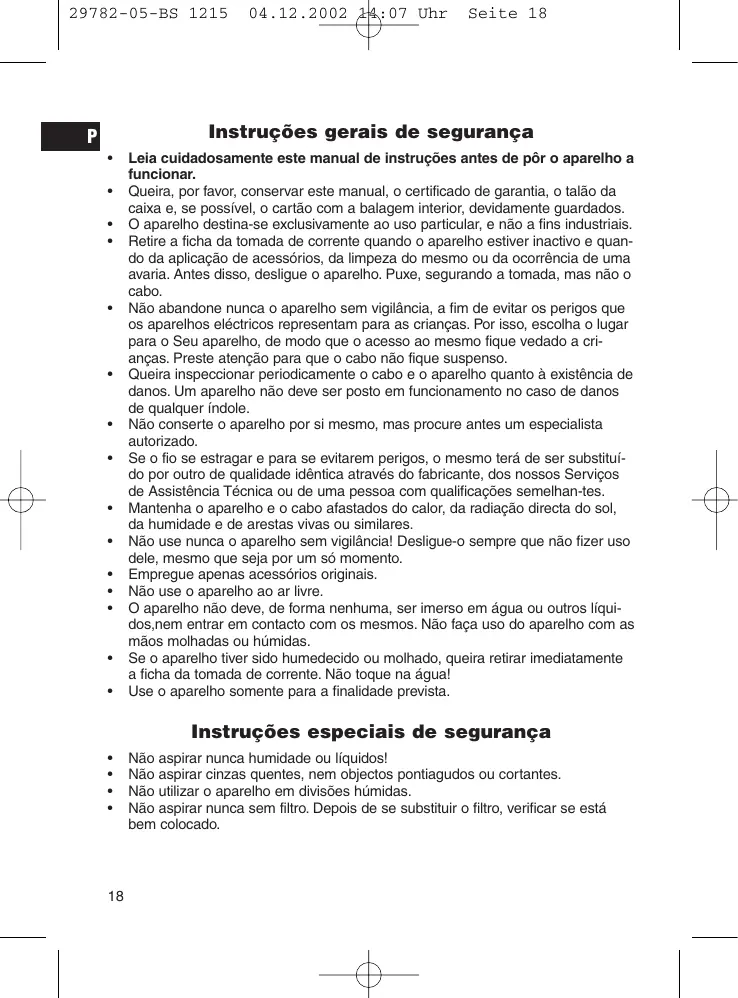 Leia cuidadosamente este manual de instruções antes de pôr o aparelho a funcionar. Queira, por favor, conservar este manual, o certificado de garantia, o talão da caixa e, se possível, o cartão com a balagem interior, devidamente guardados. O aparelho destina-se exclusivamente ao uso particular, e não a fins industriais. Retire a ficha da tomada de corrente quando o aparelho estiver inactivo e quando da aplicação de acessórios, da limpeza do mesmo ou da ocorrência de uma avaria. Antes disso, desligue o aparelho. Puxe, segurando a tomada, mas não o cabo. Não abandone nunca o aparelho sem vigilância, a fim de evitar os perigos que os aparelhos eléctricos representam para as crianças. Por isso, escolha o lugar para o Seu aparelho, de modo que o acesso ao mesmo fique vedado a crianças. Preste atenção para que o cabo não fique suspenso. Queira inspeccionar periodicamente o cabo e o aparelho quanto à existência de danos. Um aparelho não deve ser posto em funcionamento no caso de danos de qualquer índole. Não conserte o aparelho por si mesmo, mas procure antes um especialista autorizado. Se o fio se estragar e para se evitarem perigos, o mesmo terá de ser substituído por outro de qualidade idêntica através do fabricante, dos nossos Serviços de Assistência Técnica ou de uma pessoa com qualificações semelhan-tes. Mantenha o aparelho e o cabo afastados do calor, da radiação directa do sol, da humidade e de arestas vivas ou similares. Não use nunca o aparelho sem vigilância! Desligue-o sempre que não fizer uso dele, mesmo que seja por um só momento. Empregue apenas acessórios originais. Não use o aparelho ao ar livre. O aparelho não deve, de forma nenhuma, ser imerso em água ou outros líquidos,nem entrar em contacto com os mesmos. Não faça uso do aparelho com as mãos molhadas ou húmidas. Se o aparelho tiver sido humedecido ou molhado, queira retirar imediatamente a ficha da tomada de corrente. Não toque na água! Use o aparelho somente para a finalidade prevista.