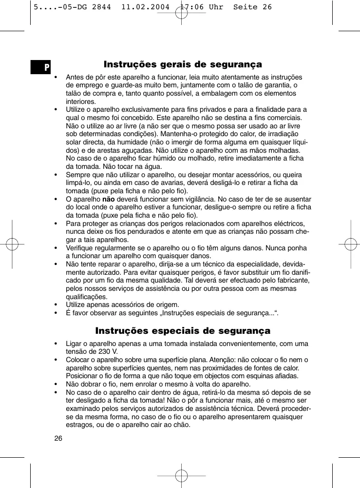 - Utilize o aparelho exclusivamente para fins privados e para a finalidade para a qual o mesmo foi concebido. Este aparelho não se destina a fins commerciais. Não o utilize ao ar livre (a não se ser que o mesmo possa ser uso ao ar livre sob determinadas condições). Mantenha-o protegido do calor, de iradiação solar directa, da humidade (não o imergir de forma alguma em quaisquer liquidos) e de arestas aguçadas. Não utilize o aparelho com as mões molhadas. No caso de o aparelho ficar húmido ou molhado, retire imeditamente a ficha da tomada. Não tocar na agua.