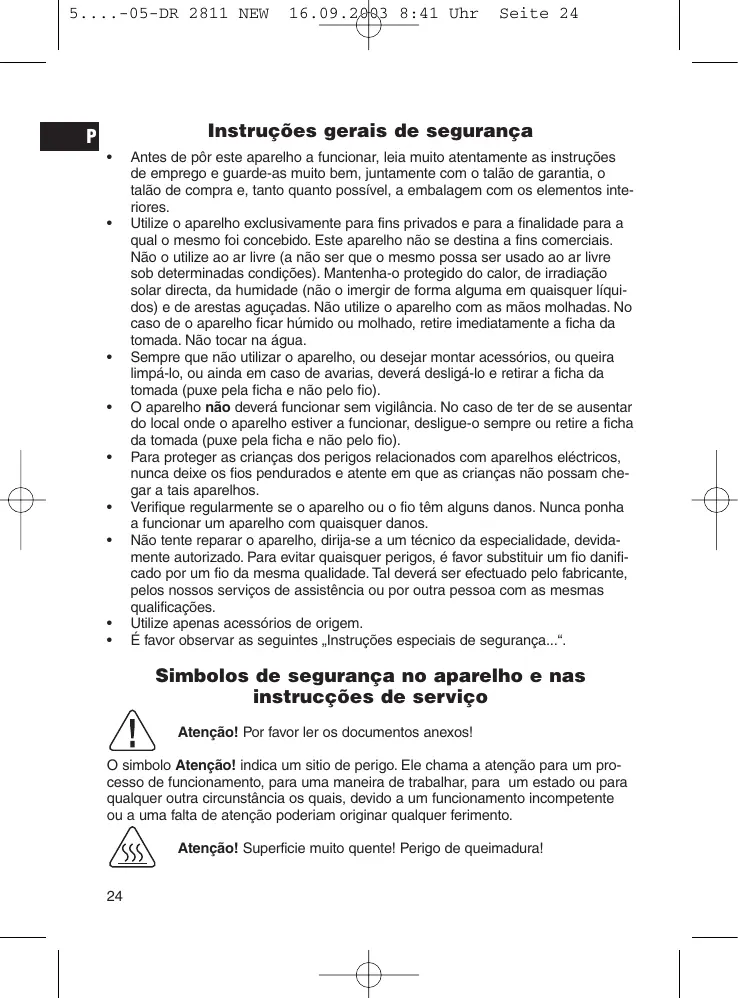 Antes de pôr este aparelho a funcionar, leia muito atentamente as instruções de emprego e guarde-as muito bem, juntamente com o talão de garantia, o talão de compra e, tanto quanto possível, a embalagem com os elementos interiores. Utilize o aparelho exclusivamente para fins privados e para a finalidade para a qual o mesmo foi concebido. Este aparelho não se destina a fins comerciais. Não o utilize ao ar livre (a não ser que o mesmo possa ser usado ao ar livre sob determinadas condições). Mantenha-o protegido do calor, de irradiação solar directa, da humidade (não o imergir de forma alguma em quaisquer líquidos) e de arestas aguçadas. Não utilize o aparelho com as mãos molhadas. No caso de o aparelho ficar húmido ou molhado, retire imediatamente a ficha da tomada. Não tocar na água. Sempre que não utilizar o aparelho, ou desejar montar acessórios, ou queira limpá-lo, ou ainda em caso de avarias, deverá desligá-lo e retirar a ficha da tomada (puxe pela ficha e não pelo fio). O aparelho não deverá funcionar sem vigilância. No caso de ter de se ausentar do local onde o aparelho estiver a funcionar, desligue-o sempre ou retire a ficha da tomada (puxe pela ficha e não pelo fio). Para proteger as crianças dos perigos relacionados com aparelhos eléctricos, nunca deixe os fios pendurados e atente em que as crianças não possam chegar a tais aparelhos. Verifique regularmente se o aparelho ou o fio têm alguns danos. Nunca ponha a funcionar um aparelho com quaisquer danos. Não tente reparar o aparelho, dirija-se a um técnico da especialidade, devidamente autorizado. Para evitar quaisquer perigos, é favor substituir um fio danificado por um fio da mesma qualidade. Tal deverá ser efectuado pelo fabricante, pelos nossos serviços de assistência ou por outra pessoa com as mesmas qualificações. Utilize apenas acessórios de origem. É favor observar as seguintes „Instruções especiais de segurança...“. Simbolos de segurança no aparelho e nas instrucções de serviço Atenção! Por favor ler os documentos anexos! O simbolo Atenção! indica um sitio de perigo. Ele chama a atenção para um processo de funcionamento, para uma maneira de trabalhar, para um estado ou para qualquer outra circunstância os quais, devido a um funcionamento incompetente ou a uma falta de atenção poderiam originar qualquer ferimento. Atenção! Superficie muito quente! Perigo de queimadura!