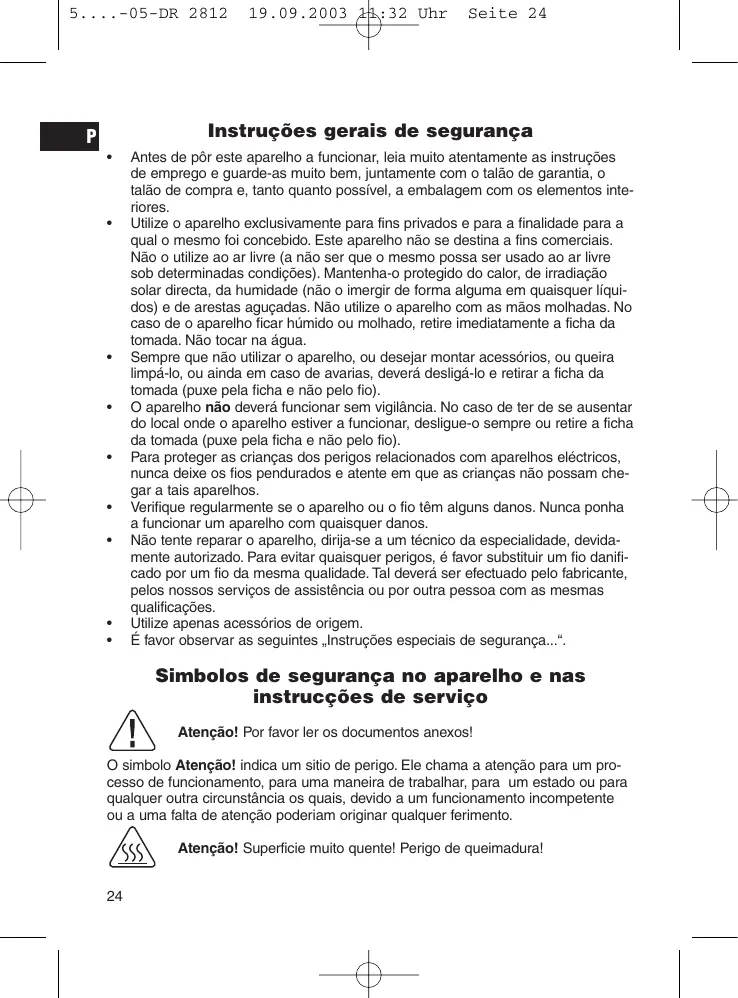 Antes de pôr este aparelho a funcionar, leia muito atentamente as instruções de emprego e guarde-as muito bem, juntamente com o talão de garantia, o talão de compra e, tanto quanto possível, a embalagem com os elementos interiores. Utilize o aparelho exclusivamente para fins privados e para a finalidade para a qual o mesmo foi concebido. Este aparelho não se destina a fins comerciais. Não o utilize ao ar livre (a não ser que o mesmo possa ser usado ao ar livre sob determinadas condições). Mantenha-o protegido do calor, de irradiação solar directa, da humidade (não o imergir de forma alguma em quaisquer líquidos) e de arestas aguçadas. Não utilize o aparelho com as mãos molhadas. No caso de o aparelho ficar húmido ou molhado, retire imediatamente a ficha da tomada. Não tocar na água. Sempre que não utilizar o aparelho, ou desejar montar acessórios, ou queira limpá-lo, ou ainda em caso de avarias, deverá desligá-lo e retirar a ficha da tomada (puxe pela ficha e não pelo fio). O aparelho não deverá funcionar sem vigilância. No caso de ter de se ausentar do local onde o aparelho estiver a funcionar, desligue-o sempre ou retire a ficha da tomada (puxe pela ficha e não pelo fio). Para proteger as crianças dos perigos relacionados com aparelhos eléctricos, nunca deixe os fios pendurados e atente em que as crianças não possam chegar a tais aparelhos. Verifique regularmente se o aparelho ou o fio têm alguns danos. Nunca ponha a funcionar um aparelho com quaisquer danos. Não tente reparar o aparelho, dirija-se a um técnico da especialidade, devidamente autorizado. Para evitar quaisquer perigos, é favor substituir um fio danificado por um fio da mesma qualidade. Tal deverá ser efectuado pelo fabricante, pelos nossos serviços de assistência ou por outra pessoa com as mesmas qualificações. Utilize apenas acessórios de origem. É favor observar as seguintes „Instruções especiais de segurança...“. Simbolos de segurança no aparelho e nas instrucções de serviço Atenção! Por favor ler os documentos anexos! O simbolo Atenção! indica um sitio de perigo. Ele chama a atenção para um processo de funcionamento, para uma maneira de trabalhar, para um estado ou para qualquer outra circunstância os quais, devido a um funcionamento incompetente ou a uma falta de atenção poderiam originar qualquer ferimento. Atenção! Superficie muito quente! Perigo de queimadura!