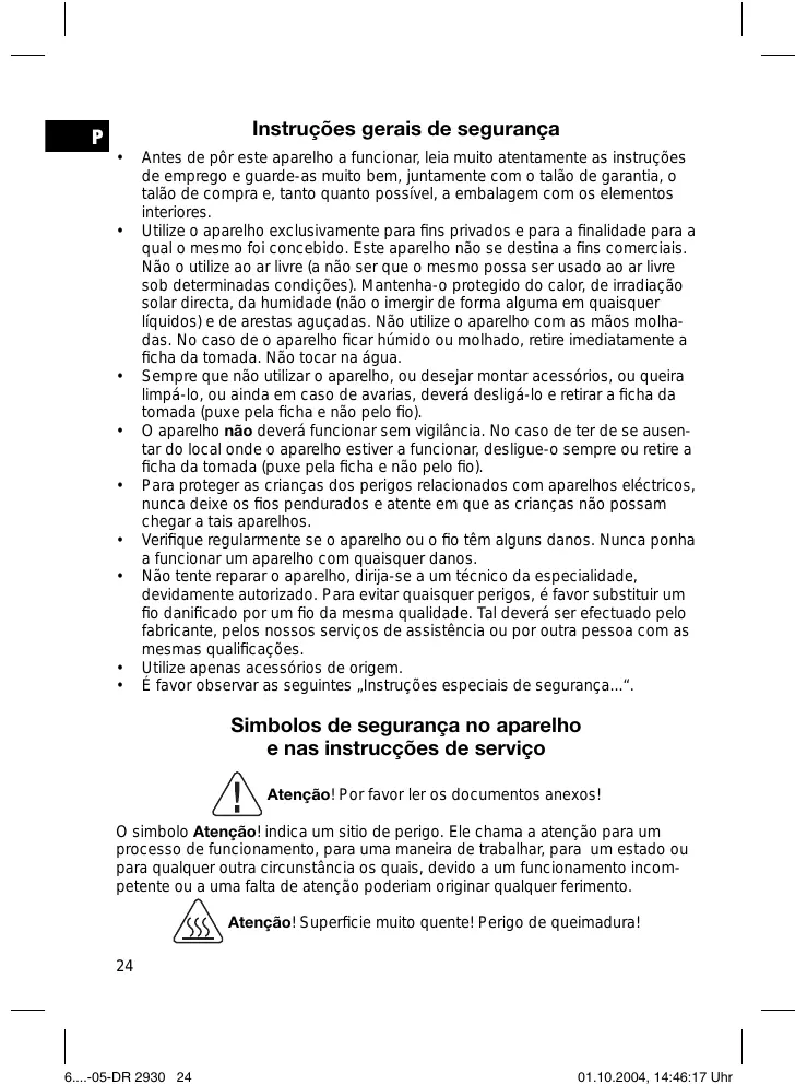 Antes de pôr este aparelho a funcionar, leia muito atentamente as instruções de emprego e guarde-as muito bem, juntamente com o talão de garantia, o talão de compra e, tanto quanto possível, a embalagem com os elementos interiores. Utilize o aparelho exclusivamente para fins privados e para a finalidade para a qual o mesmo foi concebido. Este aparelho não se destina a fins comerciais. Não o utilize ao ar livre (a não ser que o mesmo possa ser usado ao ar livre sob determinadas condições). Mantenha-o protegido do calor, de irradiação solar directa, da humidade (não o imergir de forma alguma em quaisquer líquidos) e de arestas aguçadas. Não utilize o aparelho com as mãos molhadas. No caso de o aparelho ficar húmido ou molhado, retire imediatamente a ficha da tomada. Não tocar na água. Sempre que não utilizar o aparelho, ou desejar montar acessórios, ou queira limpá-lo, ou ainda em caso de avarias, deverá desligá-lo e retirar a ficha da tomada (puxe pela ficha e não pelo fio). O aparelho não deverá funcionar sem vigilância. No caso de ter de se ausentar do local onde o aparelho estiver a funcionar, desligue-o sempre ou retire a ficha da tomada (puxe pela ficha e não pelo fio). Para proteger as crianças dos perigos relacionados com aparelhos eléctricos, nunca deixe os fios pendurados e atente em que as crianças não possam chegar a tais aparelhos. Verifique regularmente se o aparelho ou o fio têm alguns danos. Nunca ponha a funcionar um aparelho com quaisquer danos. Não tente reparar o aparelho, dirija-se a um técnico da especialidade, devidamente autorizado. Para evitar quaisquer perigos, é favor substituir um fio danificado por um fio da mesma qualidade. Tal deverá ser efectuado pelo fabricante, pelos nossos serviços de assistência ou por outra pessoa com as mesmas qualificações. Utilize apenas acessórios de origem. É favor observar as seguintes „Instruções especiais de segurança...“. Simbolos de segurança no aparelho e nas instrucções de serviço Atenção! Por favor ler os documentos anexos! O simbolo Atenção! indica um sitio de perigo. Ele chama a atenção para um processo de funcionamento, para uma maneira de trabalhar, para um estado ou para qualquer outra circunstância os quais, devido a um funcionamento incompetente ou a uma falta de atenção poderiam originar qualquer ferimento. Atenção! Superficie muito quente! Perigo de queimadura!