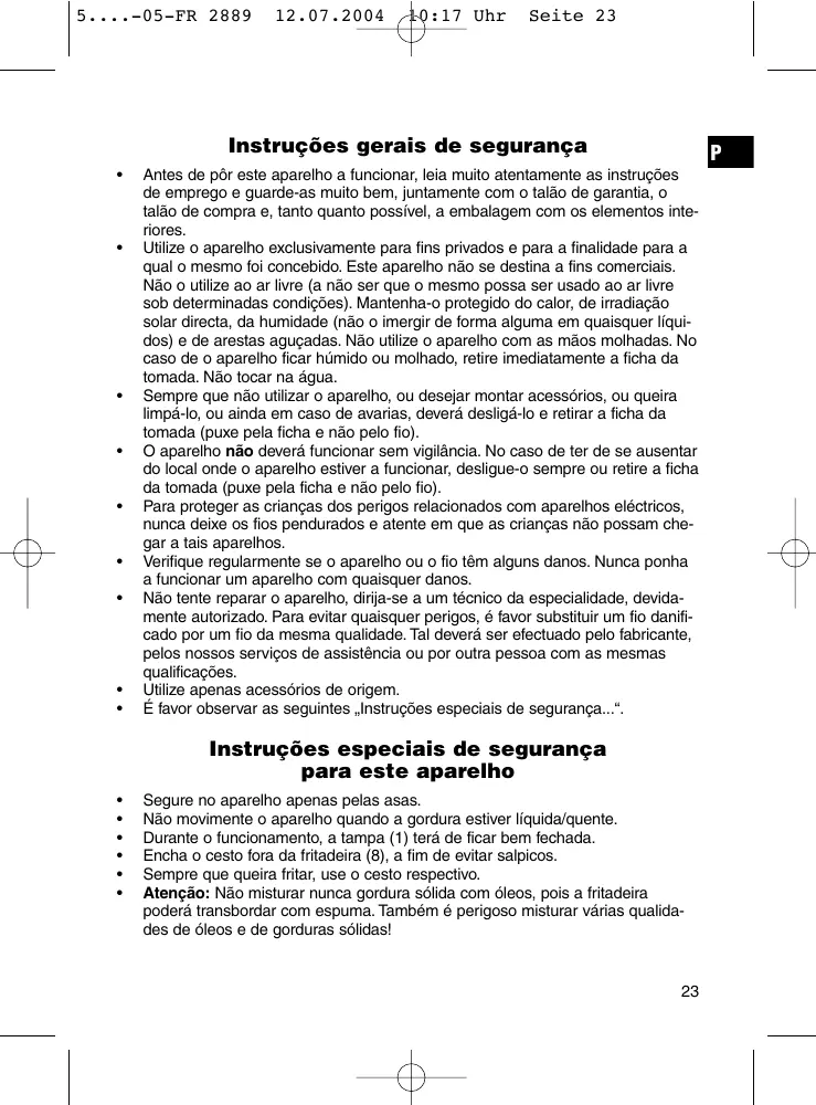 Antes de pôr este aparelho a funcionar, leia muito atentamente as instruções de emprego e guarde-as muito bem, juntamente com o talão de garantia, o talão de compra e, tanto quanto possível, a embalagem com os elementos interiores. Utilize o aparelho exclusivamente para fins privados e para a finalidade para a qual o mesmo foi concebido. Este aparelho não se destina a fins comerciais. Não o utilize ao ar livre (a não ser que o mesmo possa ser usado ao ar livre sob determinadas condições). Mantenha-o protegido do calor, de irradiação solar directa, da humidade (não o imergir de forma alguma em quaisquer líquidos) e de arestas aguçadas. Não utilize o aparelho com as mãos molhadas. No caso de o aparelho ficar húmido ou molhado, retire imediatamente a ficha da tomada. Não tocar na água. Sempre que não utilizar o aparelho, ou desejar montar acessórios, ou queira limpá-lo, ou ainda em caso de avarias, deverá desligá-lo e retirar a ficha da tomada (puxe pela ficha e não pelo fio). O aparelho não deverá funcionar sem vigilância. No caso de ter de se ausentar do local onde o aparelho estiver a funcionar, desligue-o sempre ou retire a ficha da tomada (puxe pela ficha e não pelo fio). Para proteger as crianças dos perigos relacionados com aparelhos eléctricos, nunca deixe os fios pendurados e atente em que as crianças não possam chegar a tais aparelhos. Verifique regularmente se o aparelho ou o fio têm alguns danos. Nunca ponha a funcionar um aparelho com quaisquer danos. Não tente reparar o aparelho, dirija-se a um técnico da especialidade, devidamente autorizado. Para evitar quaisquer perigos, é favor substituir um fio danificado por um fio da mesma qualidade. Tal deverá ser efectuado pelo fabricante, pelos nossos serviços de assistência ou por outra pessoa com as mesmas qualificações. Utilize apenas acessórios de origem. É favor observar as seguintes „Instruções especiais de segurança...“. Instruções especiais de segurança para este aparelho
