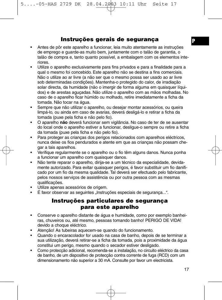 - quando o encaracolador para uso na casa de banho,(before de se terminar a sua'utilisation,deferá退回-se a ficha da tomada,pois a proximidade da agua constitui um perigo, mesmo quando o secador estiver desligado.