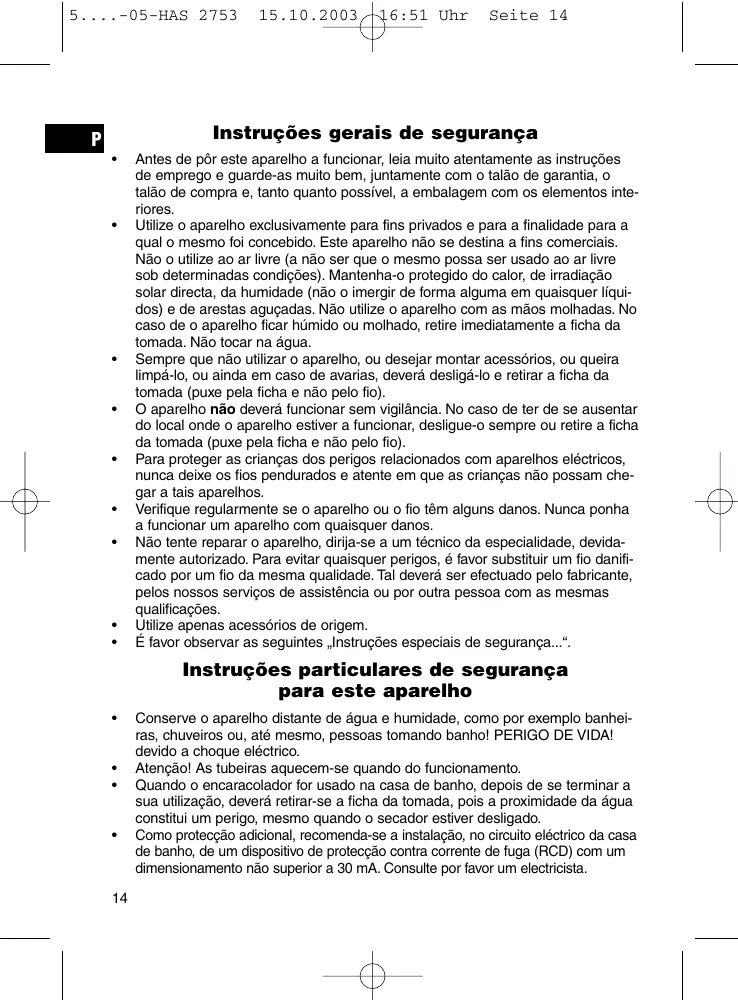 - quando o encaracolador para uso na casa de banho,(before de se terminar a sua'utilisation,deferá retiring-se a ficha da tomada,pois a proximidade da agua constitui um perigo, mesmo quando o secador estiver desligado.
